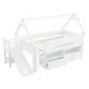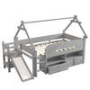 Dieses graue Spielbett mit dachförmigem Rahmen begeistert durch eine integrierte Sicherheitsrutsche, Schubladen und einen vielseitigen Spielbereich unter dem Bett. Die Schutzgitter und die stabile Massivholzkonstruktion sorgen für Sicherheit, während der untere Raum zum Spielen und Verstauen einlädt.