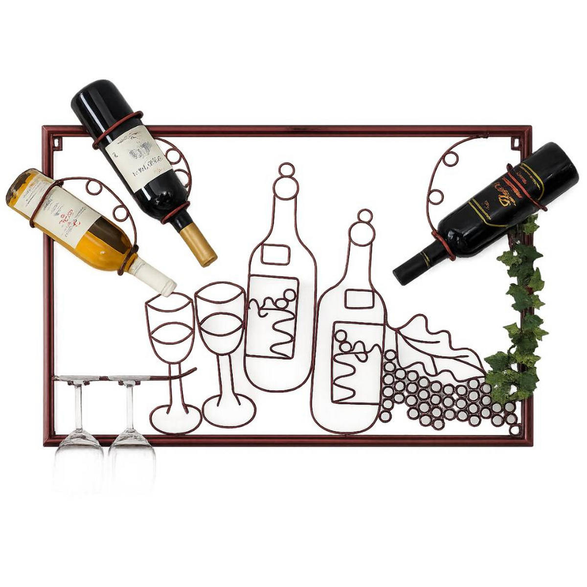 DEKORATIVES WAND-WEINREGAL AUS METALL: Dieses stilvolle Wandbild-Weinregal kombiniert kunstvolles Design mit praktischer Funktion und wird zu einem echten Blickfang in Ihrem Zuhause. Die dekorativen Elemente mit Weinmotiven verleihen Ihrer Wand eine besondere, elegante Note.