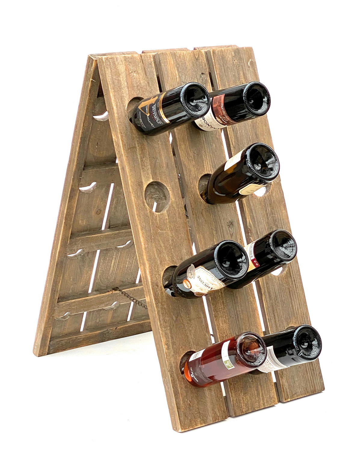 Mit dem robusten Rüttelbrett für Weinflaschen von DanDiBo können Sie bis zu 24 Flaschen Ihrer liebsten Weine, Chateaus, Champagner, Rotweine stilvoll lagern und gleichzeitig präsentieren. Die Weinflaschen werden einfach kopfüber in die vorgebohrten Öffnungen gesteckt. Dies hält die Korken der Weine feucht und verhindert das Eindringen von Luft. Ihre Weine halten sich dadurch deutlich länger. Durch die unten-mittig angebrachte Kette wird ein Umkippen des Regal nahezu unmöglich, Ihre Weine stehen somit sicher und stabil. Bei Nichtgebrauch oder zum Beispiel für den Transport können Sie das Weinregal ganz leicht zusammenklappen und verstauen. Keine Montage notwendig. Aufklappen, fertig. Material: Holz Farbe: Natur, Braun Grau Maße: Höhe 75 cm, Breite 60 cm, Tiefe 40 cm Durchmesser der Bohrungen 6,5 cm Abstand der Bohrungen vertikal 12 cm Gewicht: 4,5 kg