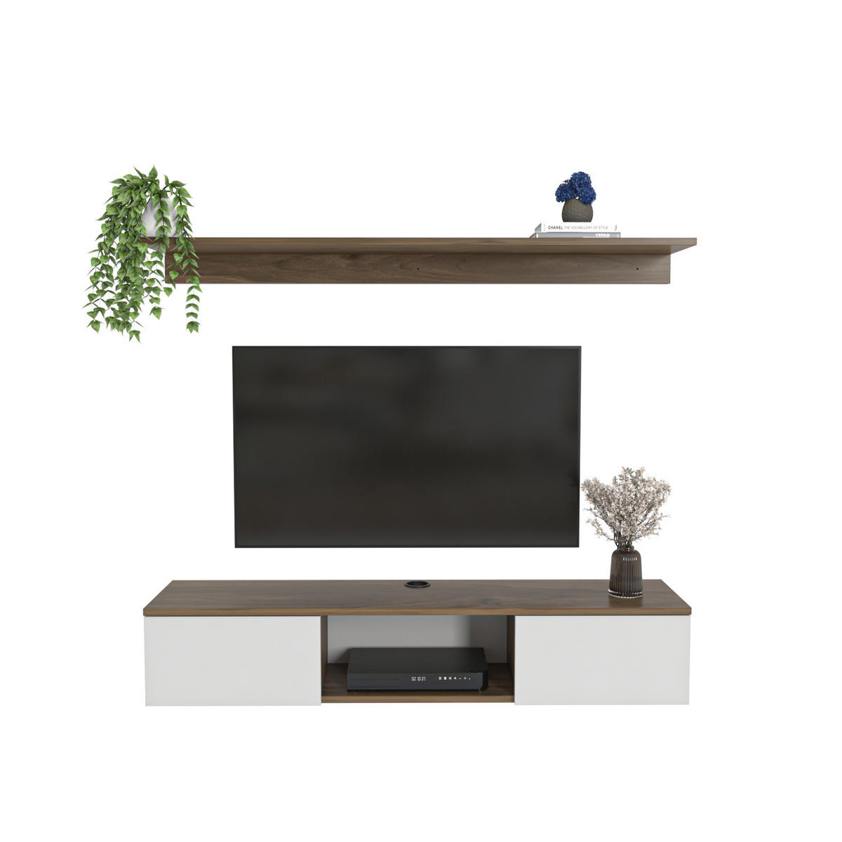 Die atemberaubende Elia Floating TV-Einheit! Mit ihrem wandmontierten Design schafft die Elia Floating TV-Einheit mehr Platz in Ihrem Wohnzimmer. Die nach unten öffnenden Türen erleichtern die Aufbewahrung, während das zentrale offene Regal einen perfekten Platz für Ihre Mediengeräte bietet. Dank der Kabelmanagement-Funktion können Sie Ihre Kabel problemlos organisieren und unschöne Kabelwirbel außer Sicht lassen. Das Paket enthält auch ein Wandregal, das einen stilvollen Platz bietet, um Ihre Dekorationsartikel und geschätzten Urlaubserinnerungen zu präsentiereDas Medienmöbel besteht aus 18 mm dickem, hochwertig melaminbeschichtetem Spanplattenmaterial und ist mit erstklassigem PVC-Kantenband versehen. Der Standfuß wird außerdem mit einem massiven Holzbein verstärkt, was ihn stabil und langlebig macht. Es wird unter Verwendung umweltfreundlicher und gesundheitsfreundlicher Materialien hergestellt. Das Produkt wird dem Kunden im Originalpaket zerlegt geliefert. Es ist so konzipiert, dass es vom Kunden einfach mit einfachen Haushaltswerkzeugen wie einem Akkuschrauber montiert werden kann. Eine Montageanleitung und Montagematerial sind im Paket enthalten. Für eine schnelle und fehlerfreie Montage sind die Produktteile gemäß der Montageanleitung mit nummerierten Aufklebern gekennzeichnet.