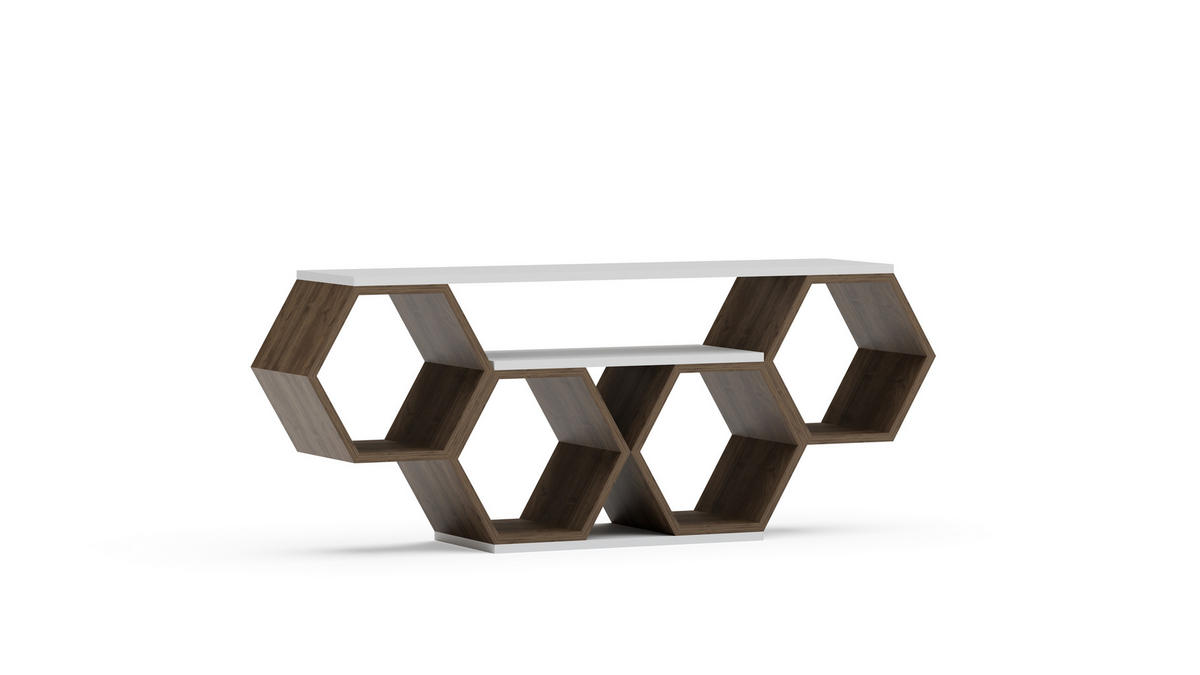 Das TV-Element Honig, das exakt einer Bienenwabe nachempfunden ist, bringt einen Hauch von Natur in Ihr Wohnzimmer. Mit seinem interessanten Design wird dieses robuste TV-Element garantiert zum Blickfang in İhrer Wohnung. Der Ständer ist ein perfekter Aufbewahrungsort für Mediacenter, Zubehör, DVD-Player, Spielkonsole, Bücher und vieles mehr. Der Ständer kann als Wackelmöbel verwendet werden, indem beide Seiten als TV-Ständer für Fernseher unterschiedlicher Größe genutzt werden können.