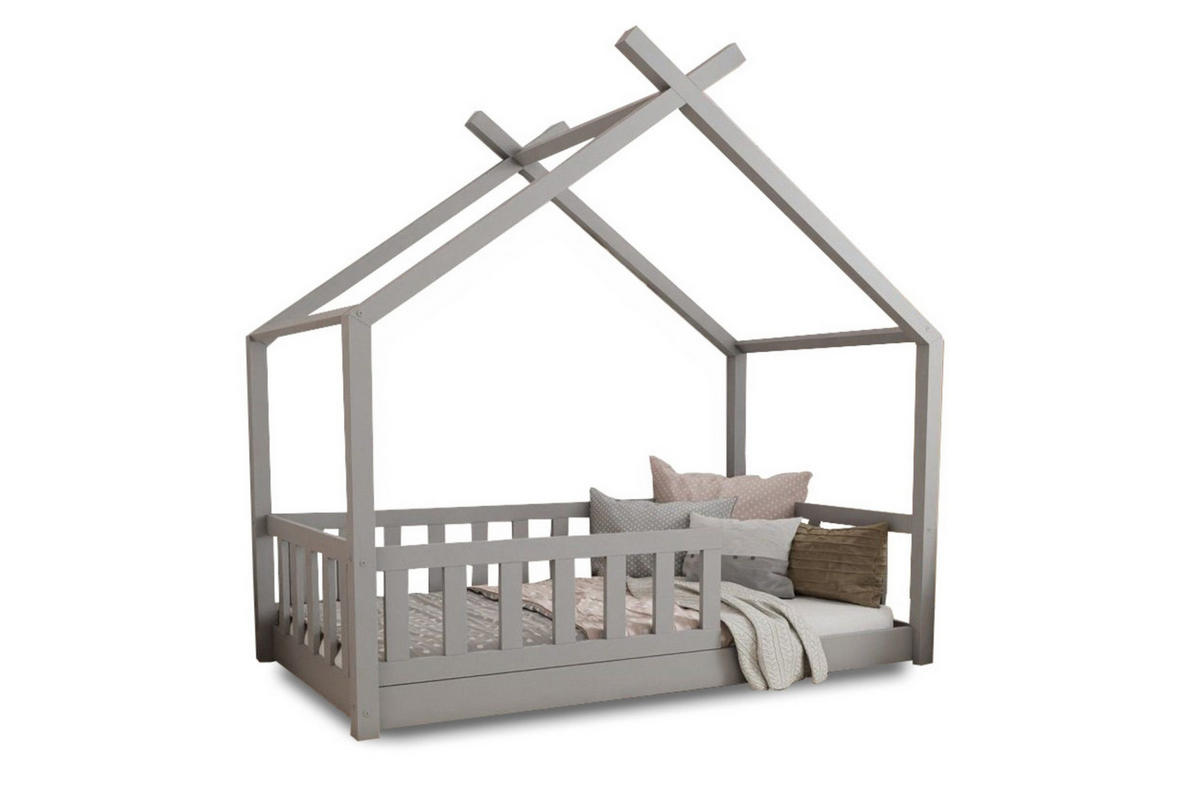 Hausbett für Kinder STAR PLUSDas Hausbett STAR PLUS ist ein sicheres und funktionales Möbelstück zum Schlafen und Spielen. Die niedrig platzierte Matratze ermöglicht es dem Kind, selbstständig ins Bett hinein- und herauszusteigen, während die Hausform die Fantasie anregt. Aus natürlichem Kiefernholz gefertigt und grau lackiert, überzeugt es durch Langlebigkeit und Ästhetik. Der abnehmbare Rausfallschutz sorgt für zusätzliche Sicherheit beim Schlafen und Spielen. Die Konstruktion lädt zum Dekorieren ein und schafft eine gemütliche Atmosphäre im Kinderzimmer.