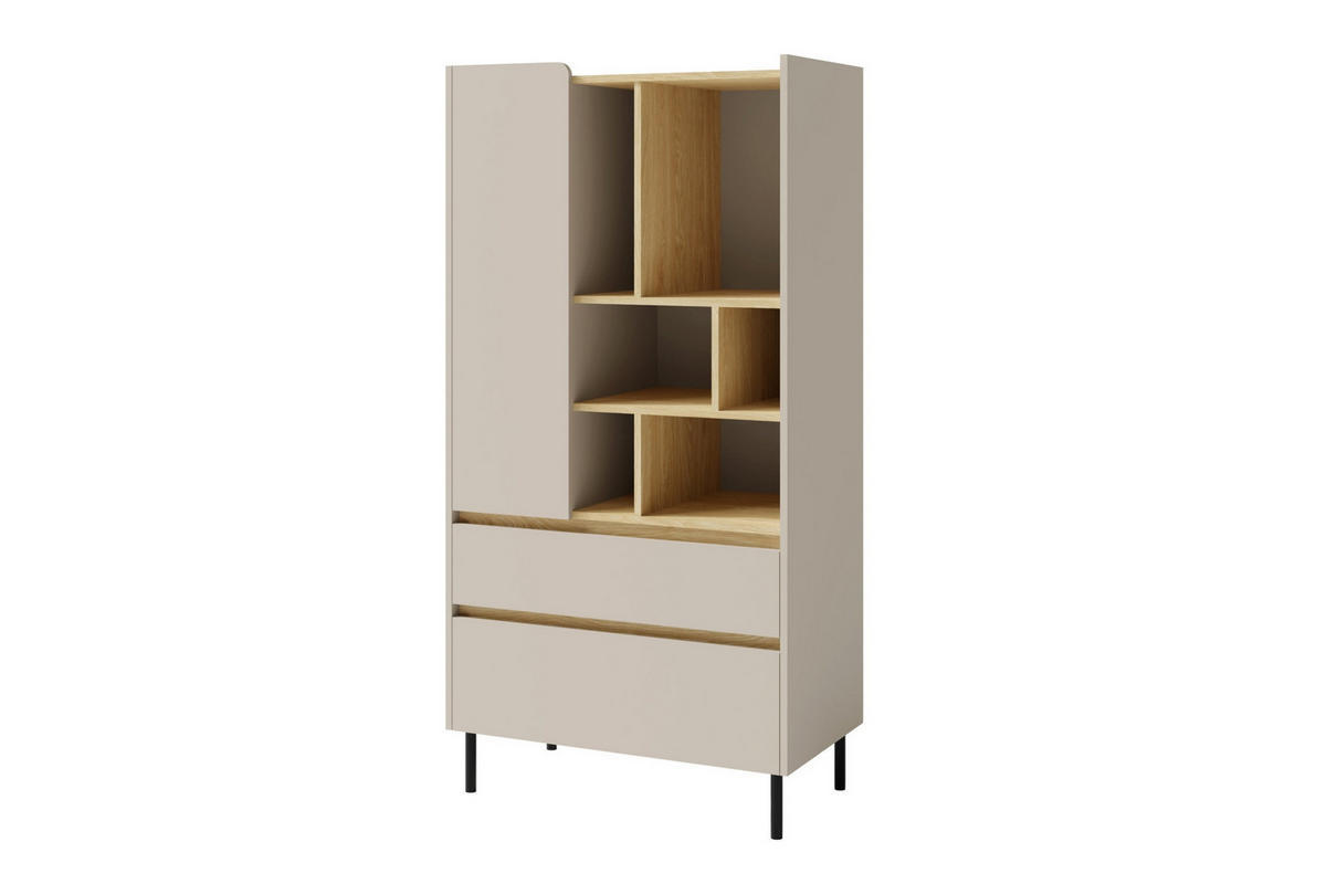 Die Kommode verfügt über zwei Schubladen und mehrere Regalfächer, die ideal für