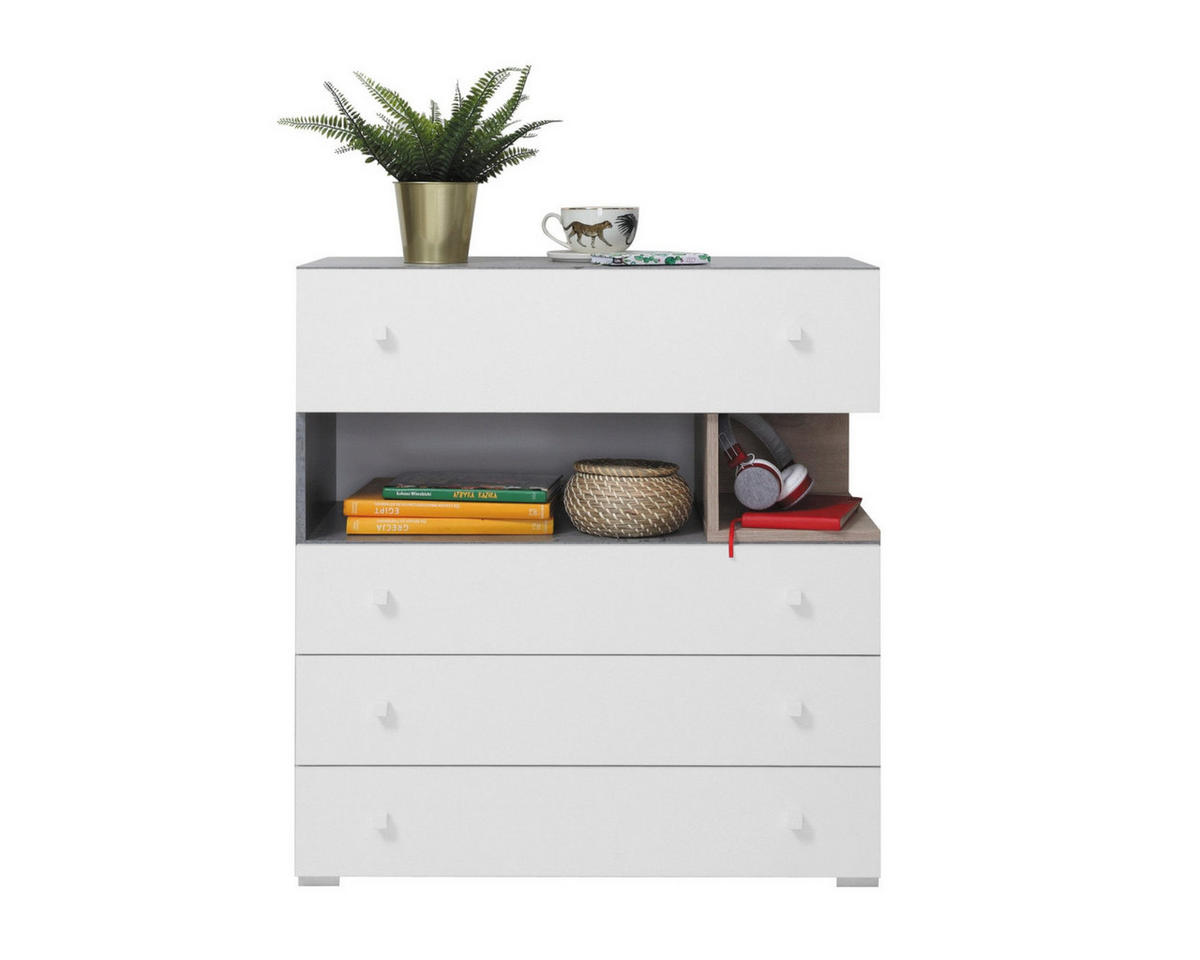 Ideal für moderne Jugendzimmer! Diese Kollektion besteht aus 16 stilvollen Elementen, erhältlich in Weiß Lux/Beton und Beton/Weiß Lux/Eiche. Gefertigt aus hochwertiger Möbelplatte, garantieren die Möbel Langlebigkeit und Robustheit.