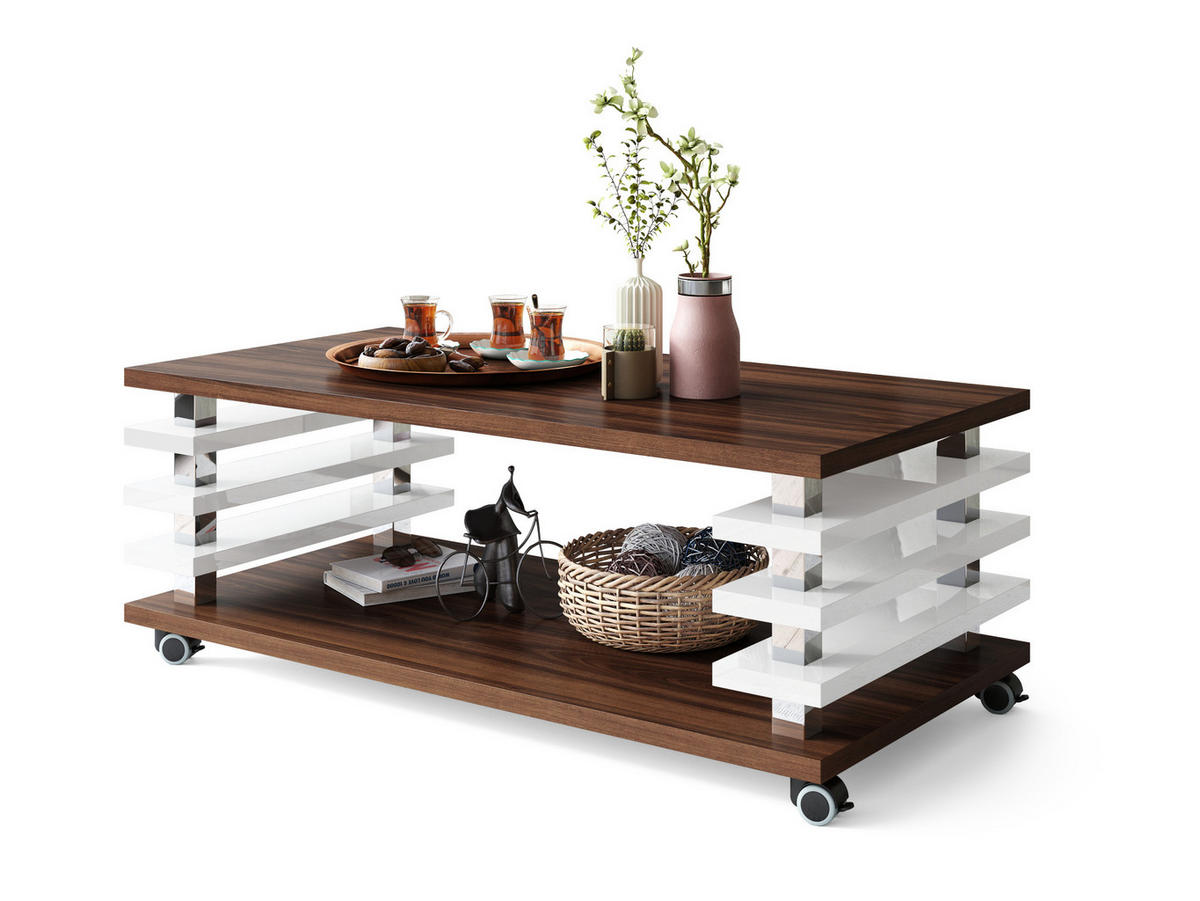 designimpex COUCHTISCH rechteckig Nussbaum - Weiß Hochglanz Ablage Rollen