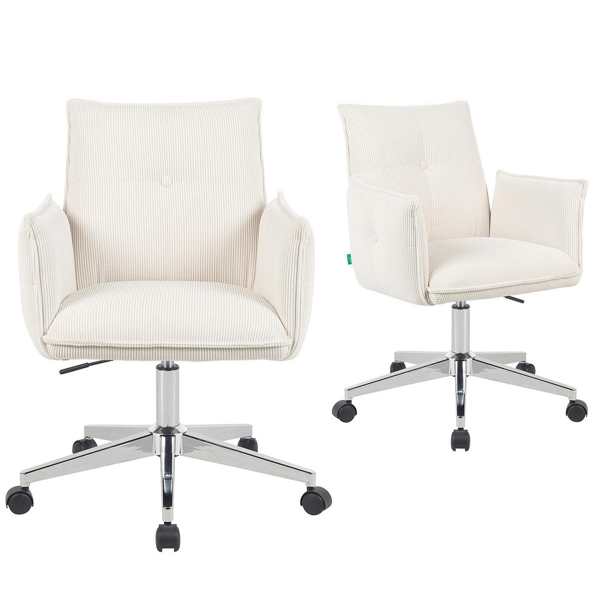 Der Bürostuhl Mika-Cleo ist die perfekte Verbindung aus modernem Design, Funktionalität und Komfort. Mit seinem eleganten Cordbezug in den Farben Creme, Grün, Anthrazit oder im stilvollen Blumenmuster fügt er sich harmonisch in jedes Büro oder Homeoffice ein. Dank der stufenlosen Höhenverstellung von 49–59 cm und der 360° Drehfunktion bietet er maximale Flexibilität, egal ob bei der Arbeit am Schreibtisch oder im Konferenzraum. Das stabile 5-Fuß-Gestell aus glänzendem Chrom ist mit Rollen ausgestattet und sorgt für leichtes, leises Gleiten auf allen Böden. Die weiche Polsterung mit Armlehnen garantiert hohen Sitzkomfort auch über längere Zeiträume. Mit einer Belastbarkeit von bis zu 125 kg ist der Mika-Cleo robust und langlebig – ein hochwertiger Drehstuhl, der Funktion und Stil ideal vereint.