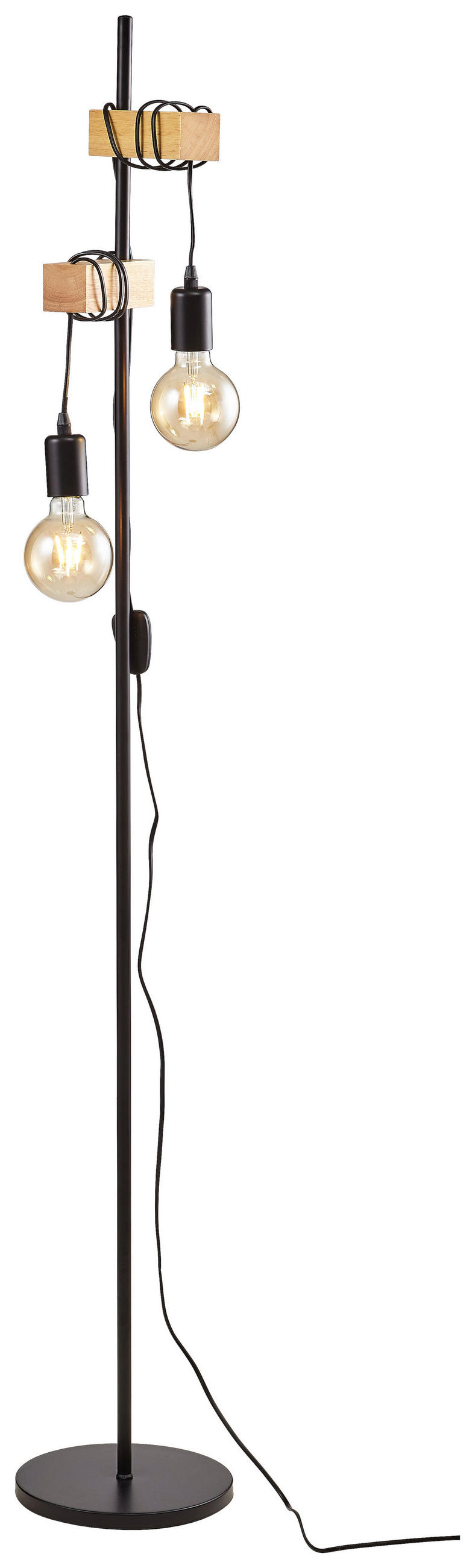Bei dieser Stehleuchte aus Stahl und Holz hängt sozusagen alles, was Licht macht, an 2 Balken: Die Kabel mit den E27-Fassungen für 2 Leuchtmittel sind um die beiden hölzernen Träger gewunden, wodurch der kernige Charme des Factory Styles betont wird. Zum Industrie-Look trägt außerdem das Gestell aus schwarzem Metall mit runder Bodenplatte bei.