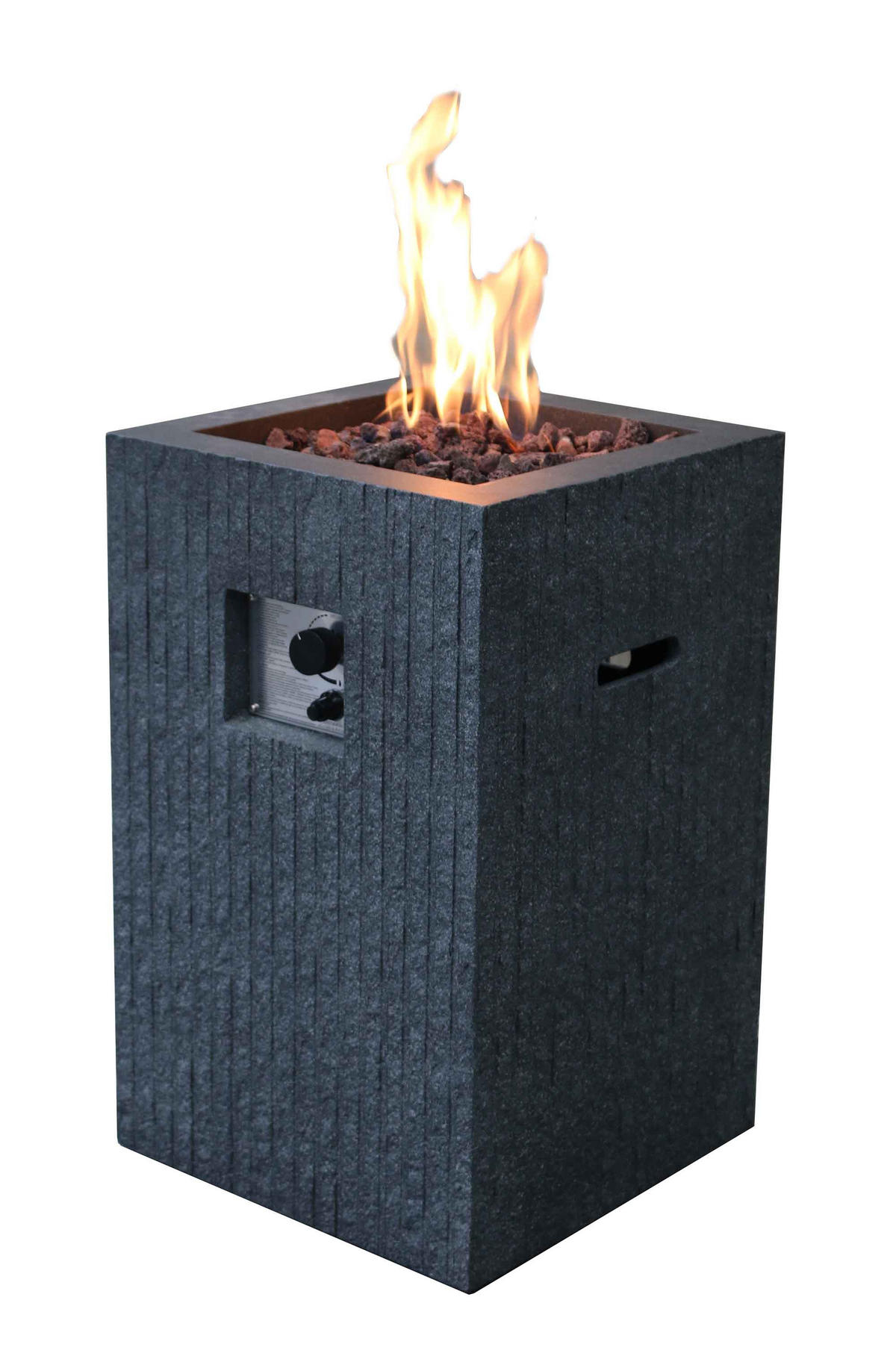 Die Gas Feuerstelle Mayon aus Faserbeton in dunkler Natursteinoptik verfügt über raue Oberfläche mit einem Streifenmuster. Lediglich die oberen Ränder sind glatt verarbeitet. Die beigefügten rötlichen Lavasteine dienen als Dekoration für die Brennereinheit. Durch die 70 cm Höhe der Feuerstelle ist das Flammenspiel viel präsenter und spendet gleichzeitig mehr Licht.