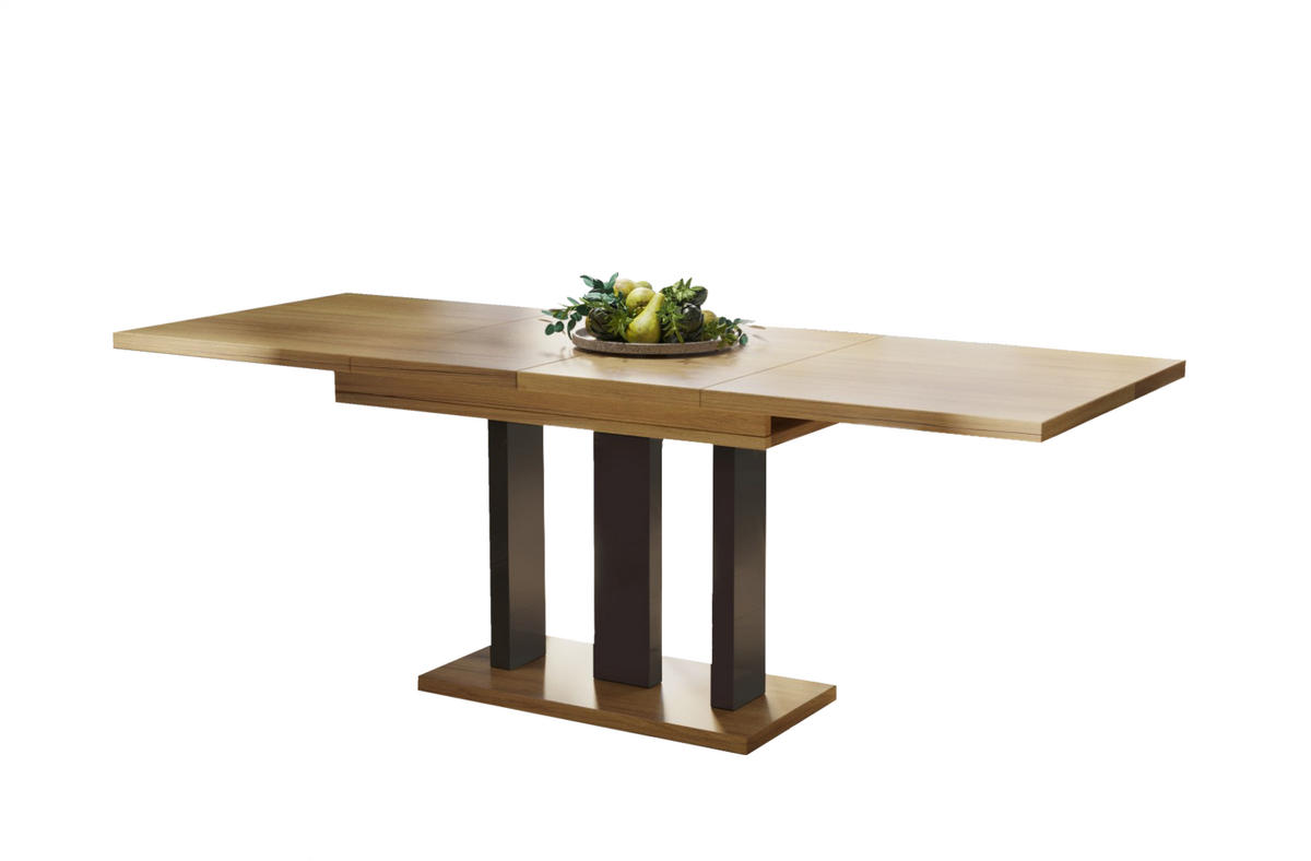 Der Esstisch ist ein elegantes Möbelstück mit drei Tischbeinen in Schwarz Matt und einer Grundgröße von 130cm, die sich mit den 40cm Erweiterungsplatten ( intern gelagert ) auf 210cm vergrößern lässt.