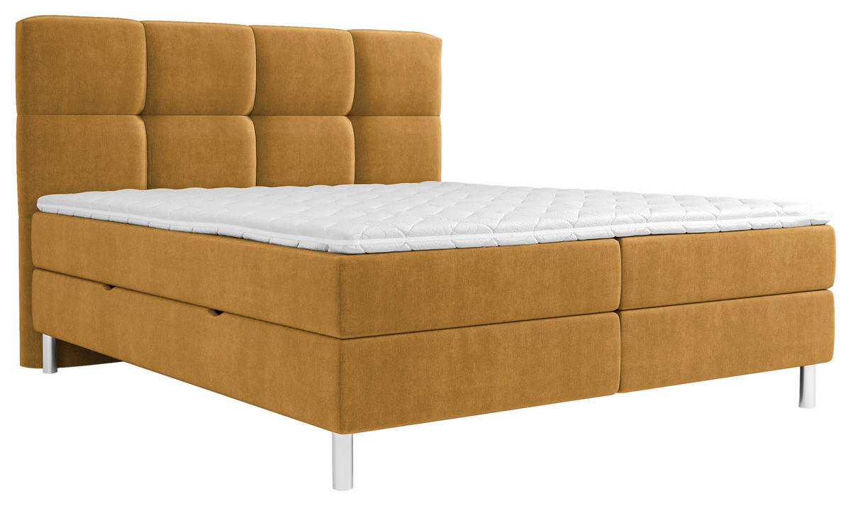 Bettkasten sorgt für Ordnung und stellt Platz für persönliche Accessoires bereit. Gönnen Sie sich den Schlaf, den Sie verdienen – entdecken Sie jetzt Ihr neues Boxbett (ca. 160 x 200 cm) in Orange sowie Currygelb mit Bettkasten, Topper und gepolstertem Kopfteil!