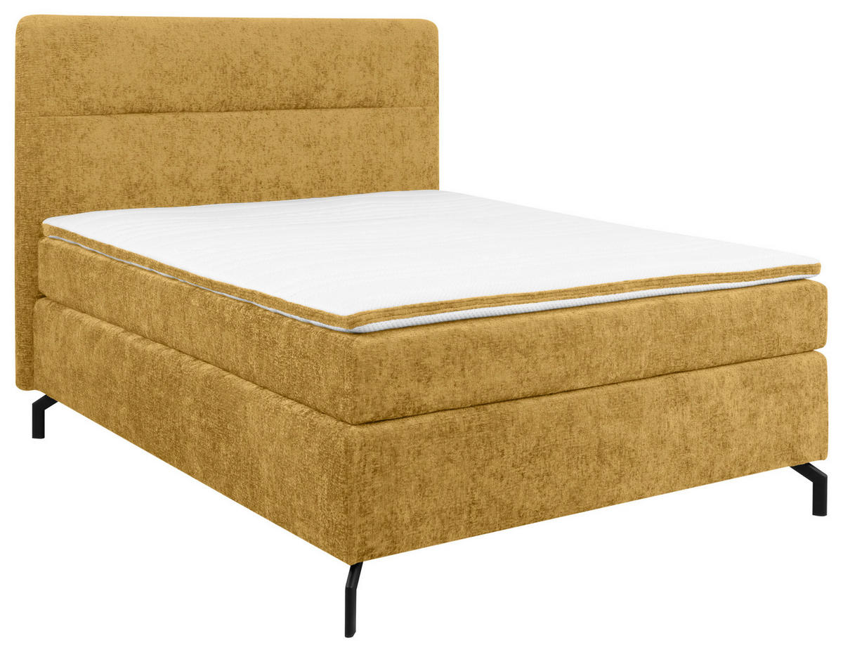 Schwarz das Design. Realisieren Sie ein kuscheliges Schlafzimmer-Upgrade mit diesem Boxspringbett (ca. 140 x 200 cm) in Currygelb inklusive Topper und gepolstertem Kopfteil – weil Qualität und Ästhetik keine Kompromisse brauchen!