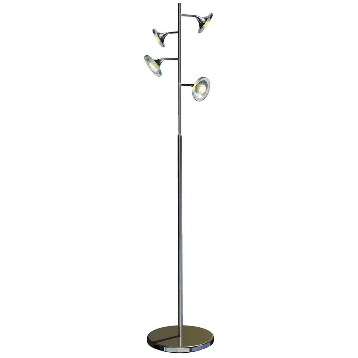 Diese LED Stehleuchte präsentiert sich in einem glänzenden Chrom Finish mit silbernen Akzenten und einem Glas-Schirm. Mit einer Höhe von 175 cm fügt sie sich ideal in Wohn- oder Arbeitsbereiche ein und sorgt mit vier integrierten LED-Leuchtmitteln für eine angenehme und gleichmäßige Ausleuchtung. Der Schalter im Anschlusskabel ermöglicht eine bequeme Bedienung. Die schlanke Form und das stilvolle Design machen diese Standlampe zu einem dekorativen Highlight, das sowohl als Lichtquelle als auch als Einrichtungselement überzeugt.
