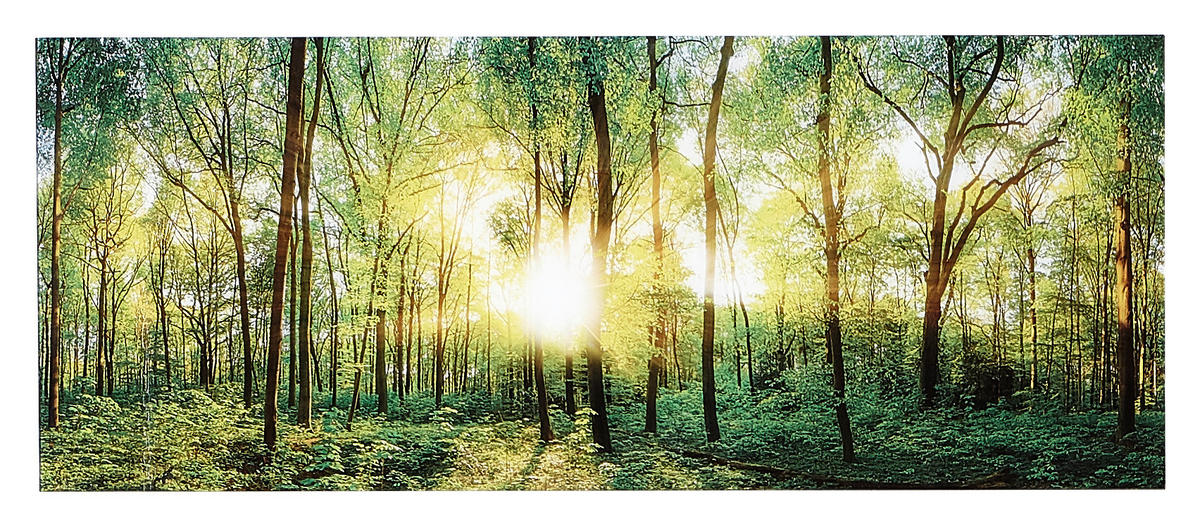 Dieses Glasbild (B x H: ca. 125 x 50 cm) mit Landschaftsmotiv weckt den Entdeckergeist in Ihnen: Hier bekommt man sofort Wanderlust. Die Sonne erscheint im Hintergrund und durchflutet den Wald - die Strahlen kitzeln förmlich auf der Haut. Die Fotografie zeigt hochgewachsene Bäume und blühende Pflanzen in leuchtenden Grünnuancen, wodurch ein sanftes Ambiente entsteht.