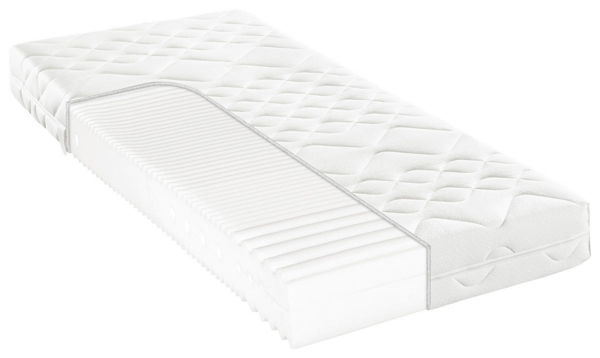 Kaltschaumkerns, wie seine formbeständige, feuchtigkeitsableitende Beschaffenheit mit gleichmäßiger Porung und die gute Punktelastizität, versprechen bequemen Liegekomfort. In einem durchgehenden Bezug befinden sich bei dieser