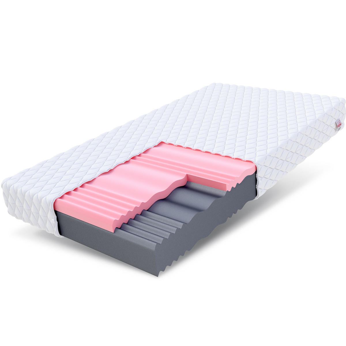 PUNKTELASTISCHER MARKEN-KALTSCHAUMKERN MIT 7 LIEGEZONEN - in ergonomisch abgestimmter Form, gute und körpergerechte Druckentlastung für Ihren Schlafkomfort, beide Liegeseiten mit gleicher Stützkraft verwendbar.