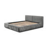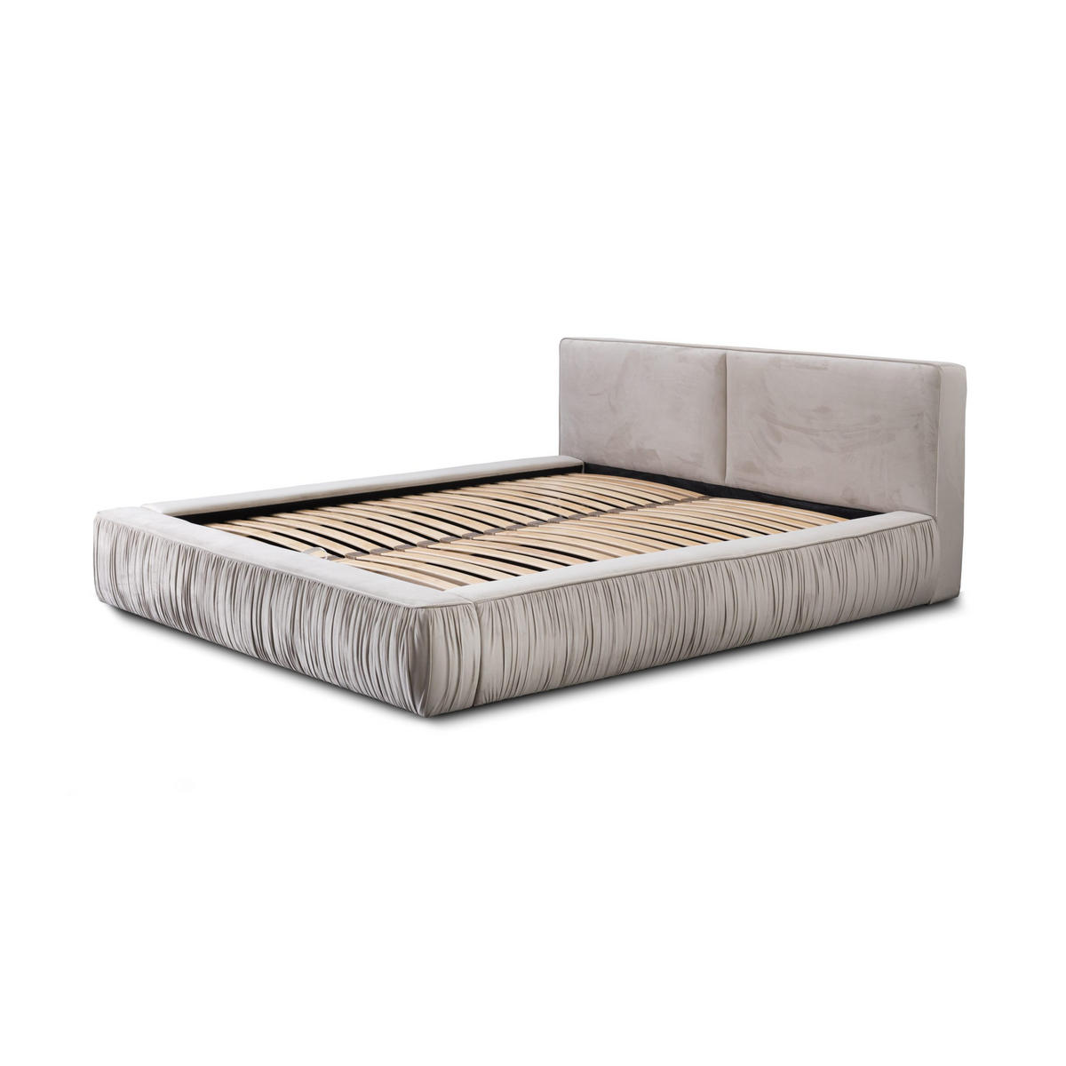 Sehr breiter Bettrahmen, der wunderbar zum Schlafen einlädt. Sowohl die Kopfteile als auch der Rahmen sind mit weicher Wattierung und Samtstoff mit einer effektvollen Falte am Rahmen bezogen. Das Bett ist luxuriös und elegant. Die Seiten der Struktur reichen fast bis zum Boden und hinterlassen einen kleinen Spalt, der die Luftzirkulation unter dem Bett ermöglicht.