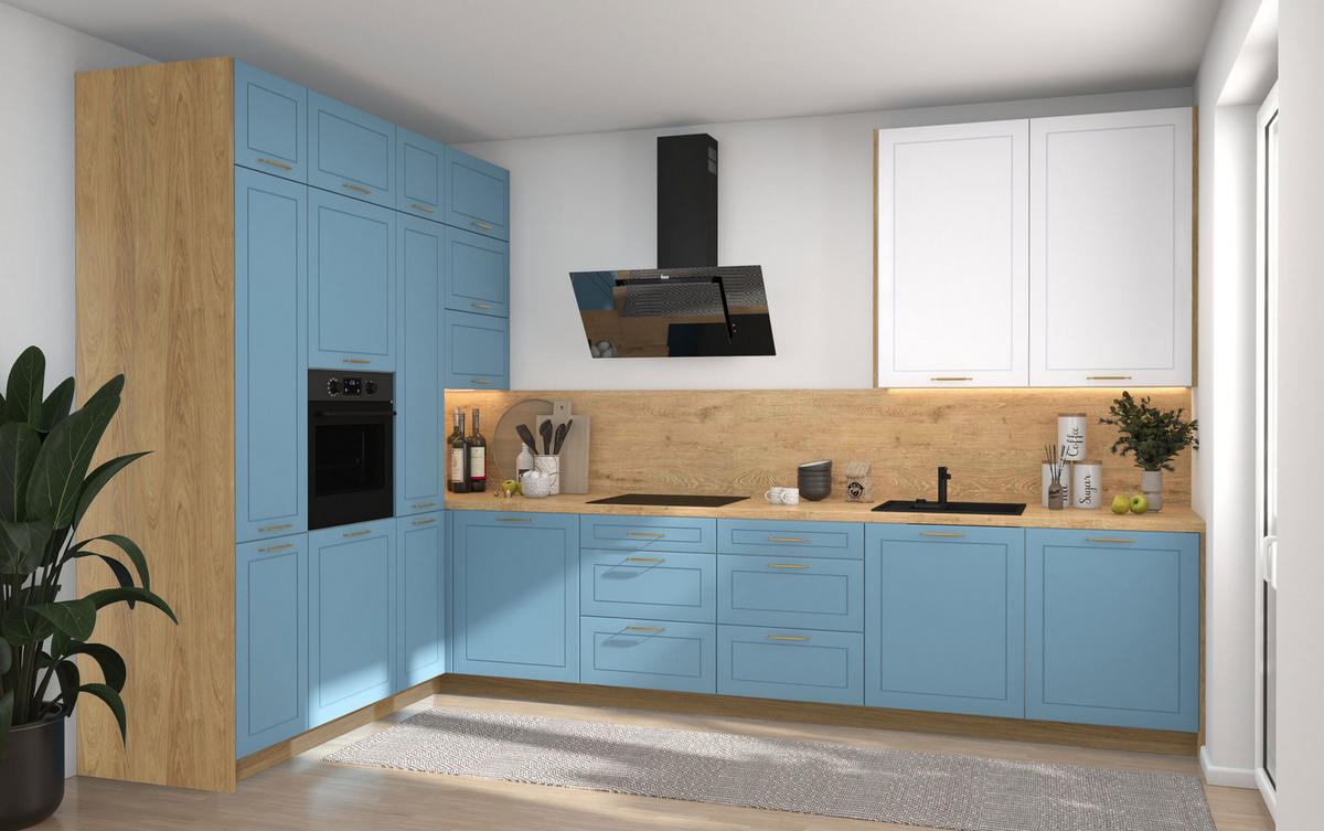 16-teilige Küchenzeile in moderner Optik mit matten Fronten, mit dekorativen Fräsungen.