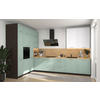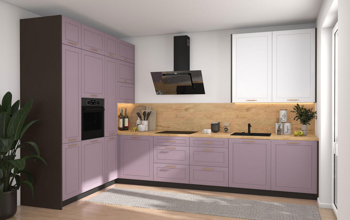 16-teilige Küchenzeile in moderner Optik mit matten Fronten, mit dekorativen Fräsungen.