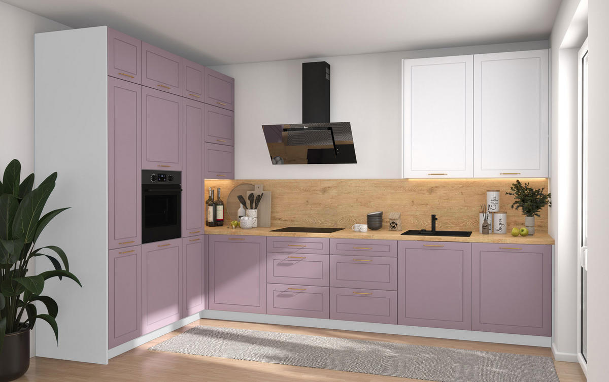 L-FORM KÜCHENZEILE Bari (16-tlg) Weiß / Pastellviolett - Signalweiß / REJS Vollauszug - Violett, Holzwerkstoff/Metall (347/243/202cm) - Feldmann-WohnenFeldmann-Wohnen