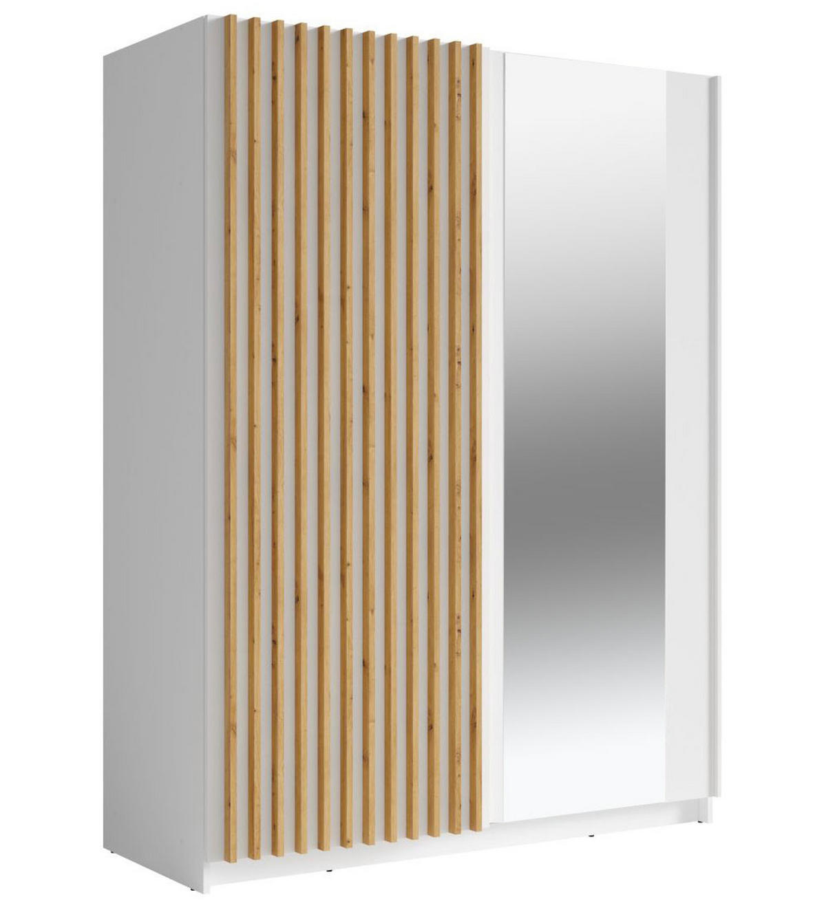 Die Lamellen in moderner Holzoptik verleihen diesem Schrank einen zeitlos eleganten Look und dienen zugleich als Griffleiste zum öffnen der linken Tür.