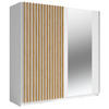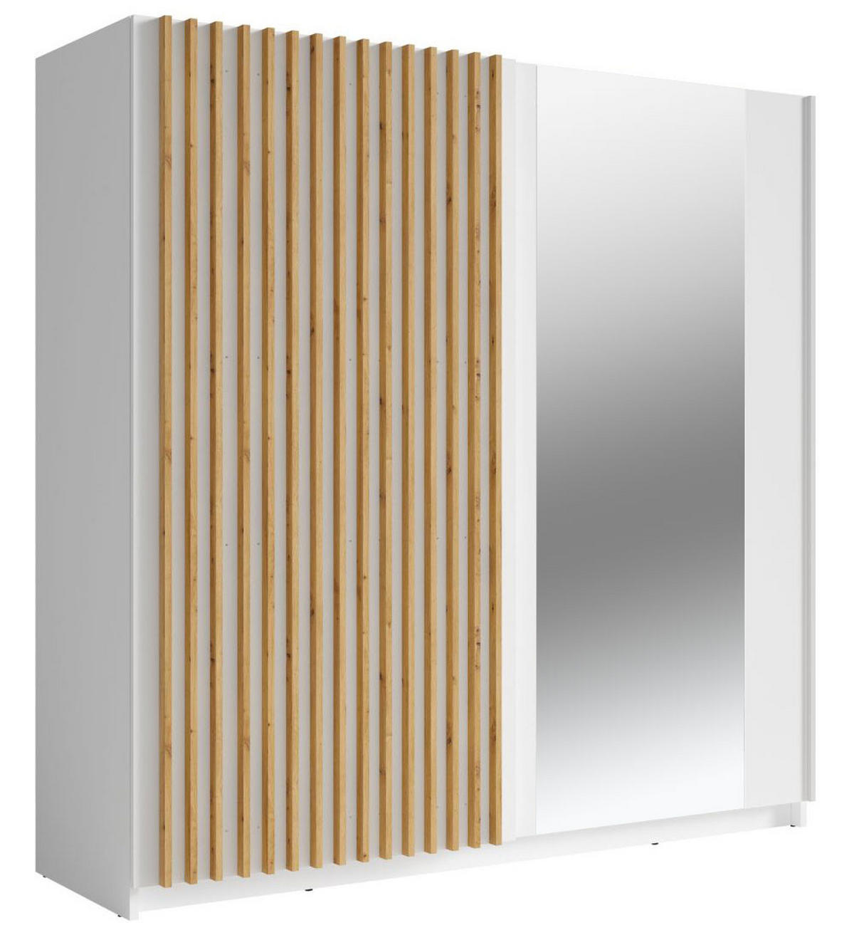 Die Lamellen in moderner Holzoptik verleihen diesem Schrank einen zeitlos eleganten Look und dienen zugleich als Griffleiste zum öffnen der linken Tür.