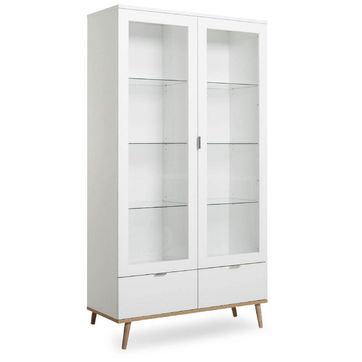 Setzen Sie Ihre Lieblingsstücke mit dieser Vitrine perfekt in Szene! Hinter den 2 eleganten Glasrahmentüren verstecken sich 6 Glasböden, ideal für das Ausstellen von Glaswaren, Vasen oder besonderen Erinnerungsstücken. Zusätzlich bieten die 2 Schubkästen praktischen Stauraum für alles, was ordentlich aufbewahrt werden muss. Das Zusammenspiel von Weiß und Sonoma Eiche sorgt für ein modernes, aber zugleich warmes Ambiente in Ihrem Zuhause. Massivholzfüße und silberne Metallgriffe setzen stilvolle Akzente, während die Melaminbeschichtung und ABS-Kanten für Robustheit und Langlebigkeit garantieren. Diese Vitrine ist ein wahres Highlight für jedes Wohnzimmer!