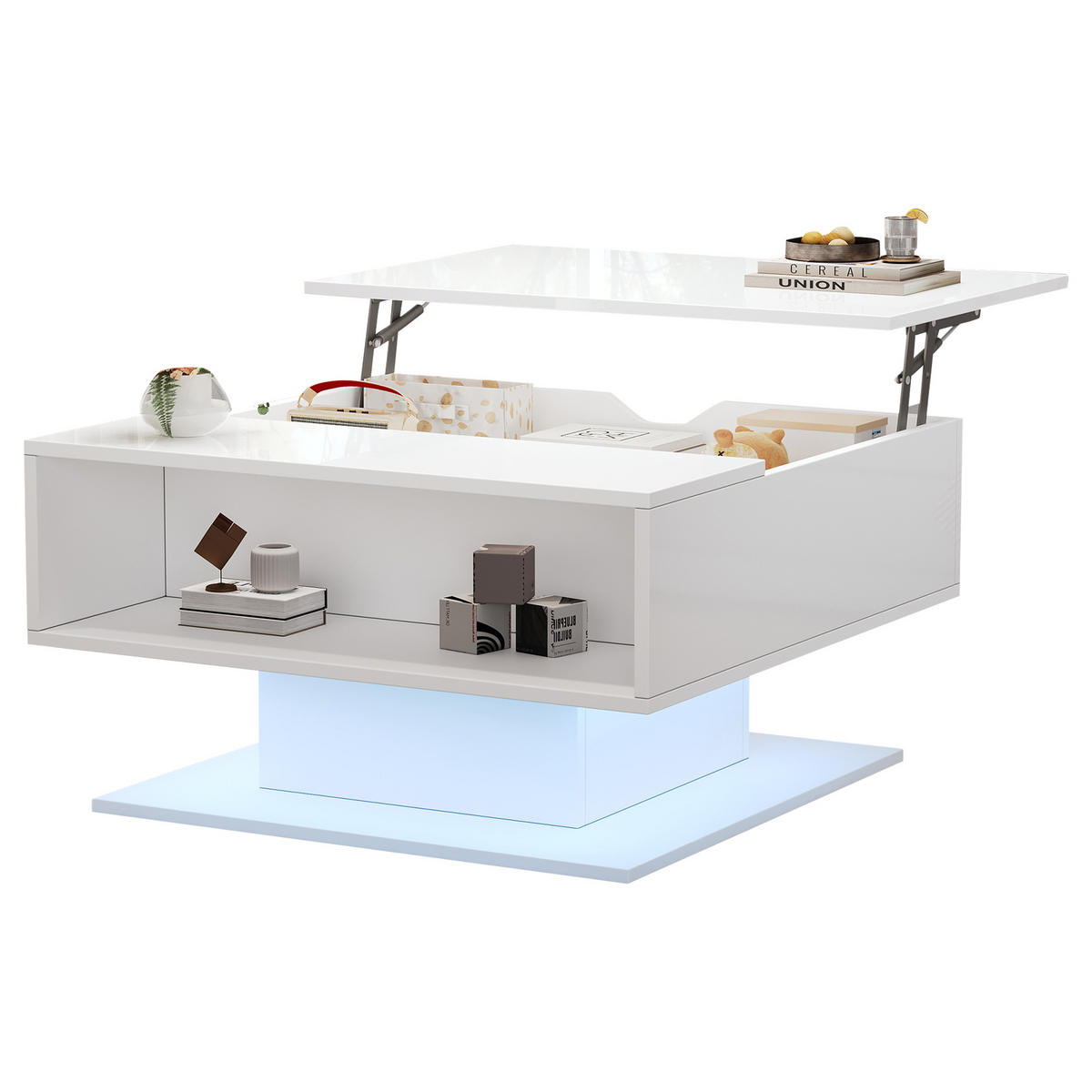 Gesamtgröße: 80 x 75x 40 cm, anhebbarer Couchtisch, kann auf maximal 54 cm angehoben werden, mit einer oberen, schmalen unteren Form und einer Grundfläche von 65 x 65 cm. Egal ob Sie am Tisch sitzen und lesen oder arbeiten, die mittlere Bauform eignet sich sehr gut zum Sitzen. Es gibt eine anhebbare Tischplatte mit einem versteckten Stauraum unter der Tischplatte. Der andere Teil der Schreibtischplatte dient als halboffener Ablagebereich für Dekorationen. Es handelt sich um einen Hochglanz-Sofatisch, wobei die Hochglanzposition auf die Oberseite der Tischplatte + 3 Seitenteile beschränkt ist. Es verfügt über einen LED-Lichtstreifen, der über eine Handy-App gesteuert wird, und besteht aus Spanplatten mit einer Gesamttragfähigkeit von 40 kg.