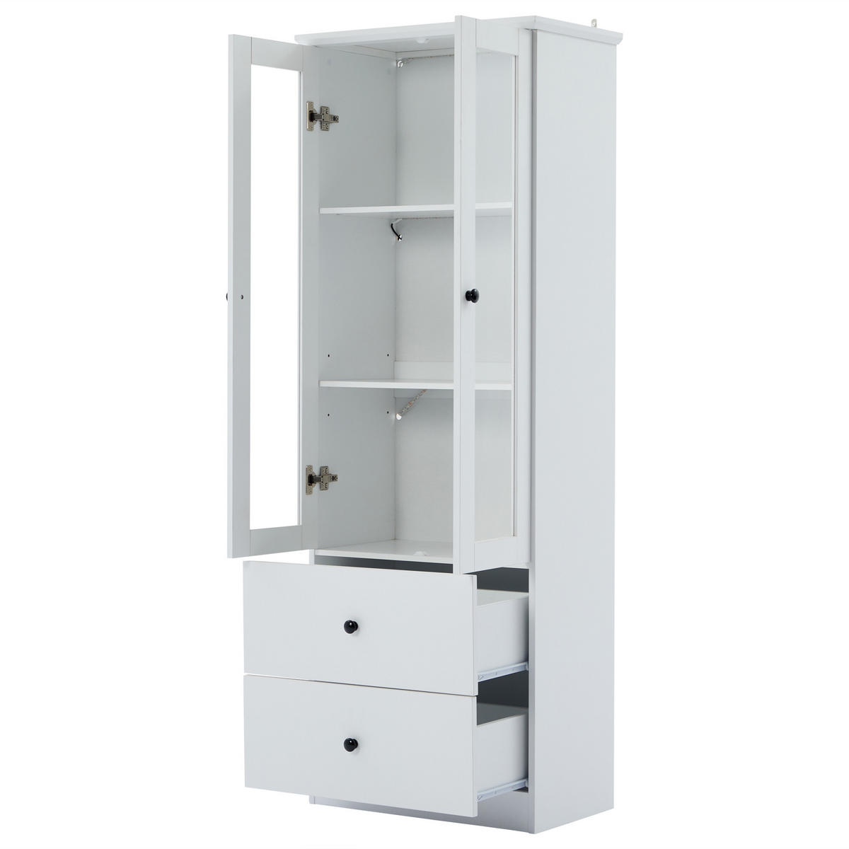 Diese elegante Vitrine verbindet zeitloses Design mit durchdachter Funktionalität. Die mattweiße MDF- und Spanplattenfront harmoniert perfekt mit den schwarzen Rundgriffen und der stimmungsvollen LED-Beleuchtung. Sie ist 165 cm hoch und bietet hinter den Doppeltüren aus Glas mit verstellbaren Einlegeböden eine großzügige Ausstellungsfläche. Zwei untere Schubladen erhöhen den Stauraum zusätzlich. Die USB-betriebene LED-Beleuchtung ist in 16 verschiedenen Farben erhältlich, so dass Sie Ihre Exponate perfekt in Szene setzen können. Mit einer Belastbarkeit von bis zu 20 kg pro Fachboden und 30 kg pro Schublade ist der Schrank für eine Vielzahl von Anwendungen geeignet. Die kompakten Abmessungen von 60x35,5 cm machen ihn zum idealen Möbelstück für eine Vielzahl von Wohnbereichen.