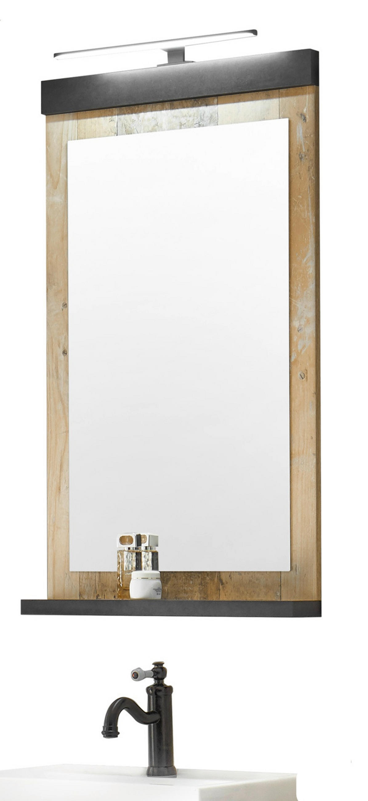 Badezimmer Spiegel "Stove", Used Wood hell und anthrazit, mit Ablage, 56 x 95 cmMit dem Badspiegel "Stove" in Used Wood Vintage hell und anthrazit (56 x 95 cm) haben Sie das passende Accessoire für Ihr Zuhause gefunden. Der rechteckige Spiegel ist aufgrund seiner Ablage für Ihr Badezimmer optimal geeignet. Er wird vertikal angebracht und macht eine gute Figur, überzeugt im Dekor Used Wood hell und in anthrazit und kann auch optisch durch seinen trendigen und natürlichen Stil punkten. Dank der unempfindlichen Beschaffenheit erweist sich das Modell "Stove" als äußerst praktisch. Der Spiegel hat eine Breite von 56 cm, eine Höhe von 95 cm und eine Tiefe von 10 cm. Dieser praktische Badspiegel passt zu vielen Stilen und ist ein wahrer Gewinn für Ihr Badezimmer.