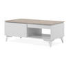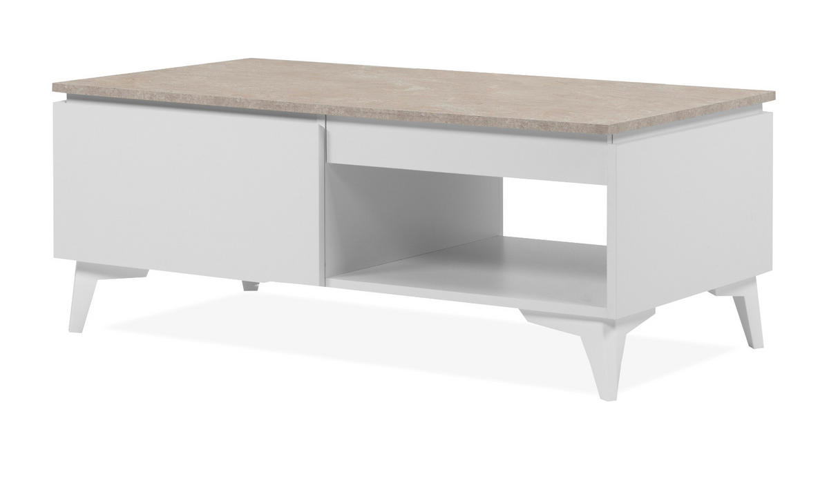 Couchtisch Visby, weiß und Sandstein Dekor, 100 x 55 cmDer stilvolle Couchtisch Visby überzeugt durch die Kombination aus weißem Korpus, einer Tischplatte im Sandstein Dekor und einer edlen Schattenfuge an der Oberseite. Das Möbelstück zeigt eine eine zeitlose Eleganz verbunden mit praktischen Details für den täglichen Gebrauch. Mit einem großzügigen Schubkasten und einem offenen Fach bietet Visby genügend Stauraum für Zeitschriften, Fernbedienungen und andere Wohnaccessoires. Die V-Füße sorgen nicht nur für Stabilität, sondern setzen auch einen dekorativen Akzent. Mit 100 x 55 cm passt der Sofatisch perfekt in Ihr Wohnzimmer und wird zum Mittelpunkt Ihrer Einrichtung.