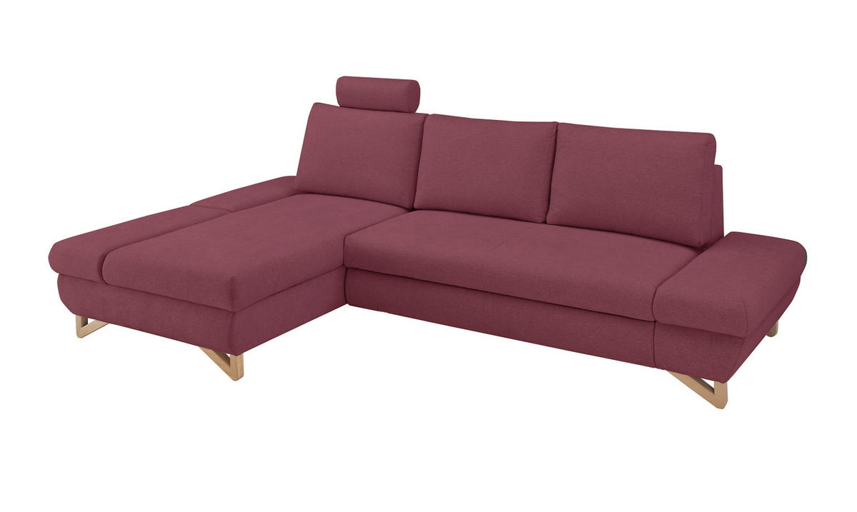 Ecksofa "Skalm", bordeaux, Velours, 284 cmDas Ecksofa "Skalm" ist ein hochwertiges Sitzmöbel von der Marke Furn.Design. Es besticht durch seine elegante Ausstrahlung und bietet hohen Komfort. Die Recamiere befindet sich auf der linken Seite und ermöglicht eine bequeme Liegeposition. Die Kopfstütze kann flexibel nach Belieben platziert werden, um optimalen Komfort zu gewährleisten. Die Armlehnen sind manuell verstellbar und bieten zusätzliche Unterstützung für die Arme oder ermöglichen ausgiebiges Liegen. Das Sofa verfügt über eine dauerhaft elastische Wellenunterfederung, die eine angenehme Sitzfläche bietet. Die Füße des Ecksofas bestehen aus Massivholz und sorgen für Stabilität und Langlebigkeit. Der Bezug besteht aus Velours in der Farbe Bordeaux und ist abriebfest, pillingbeständig und scheuerbeständig. Auch die Rückseite des Sofas ist mit dem Originalbezug versehen, sodass es frei im Raum aufgestellt werden kann. Das Ecksofa "Skalm" hat eine maximale Belastbarkeit von 350 kg, was für eine hohe Stabilität spricht. Mit seinem ansprechenden Design und den praktischen Eigenschaften ist dieses Ecksofa die perfekte Ergänzung für Ihr Wohnzimmer.