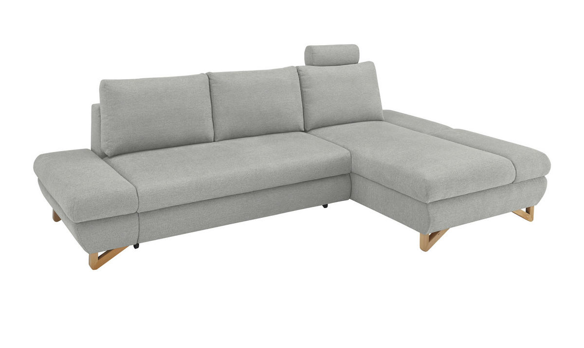 Ecksofa "Skalm", hellgrau, mit Bettfunktion und Stauraum, 284 cm"Skalm", das Ecksofa, das Ihnen Komfort und Stil bietet! Mit der Recamiere rechts und der frei positionierbaren Kopfstütze erleben Sie pure Entspannung. Verstellen Sie die Armlehnen ganz nach Ihren Wünschen und genießen Sie individuellen Komfort. Das Sofa hat eine praktische Bettfunktion mit einer großzügigen Liegefläche von ca. 138 x 245 cm. Perfekt für Gäste oder gemütliche Filmabende zu zweit. Dank des integrierten Stauraums haben Sie immer genug Platz für Decken, Kissen und alles, was Sie benötigen. Die dauerhaft elastische Wellenunterfederung sorgt für eine optimale Unterstützung und hohen Sitzkomfort. Die massiven Holzfüße verleihen dem Ecksofa eine robuste und stilvolle Optik. Der Bezug aus strapazierfähigem Strukturstoff in Hellgrau passt perfekt zu jedem Wohnstil. Und keine Sorge vor Verschleiß - unser das "Skalm" Ecksofa ist abriebfest, pillingbeständig und scheuerbeständig. Auch die Rückseite ist mit dem Originalbezug versehen, sodass Sie das Sofa frei im Raum platzieren können. Mit einer maximalen Belastbarkeit von 350 kg ist es auch für große Familien geeignet. Vertrauen Sie auf die Qualitäts-Marke Furn.Design und gönnen Sie sich den Luxus, den Sie verdienen!