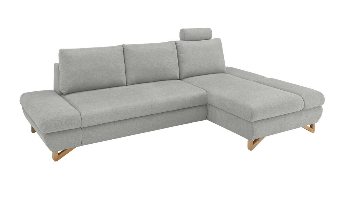 Ecksofa "Skalm", hellgrau, 284 cmDas Ecksofa "Skalm" ist ein hochwertiges Sitzmöbel der Marke Furn.Design. Es bietet Ihnen höchsten Komfort und Funktionalität. Die Recamiere befindet sich auf der rechten Seite und ermöglicht einen besonders bequemen Aufenthalt. Die Kopfstütze kann nach Belieben positioniert werden, zudem können Sie die Armlehnen manuell verstellen, um eine optimale Sitzposition zu erreichen. Dieses Sofa verfügt über eine dauerhaft elastische Wellenunterfederung, die für eine angenehme Polsterung sorgt. Die Füße sind aus Massivholz gefertigt und verleihen dem Ecksofa Stabilität und einen ansprechenden Look. Der Bezug besteht aus strapazierfähigem Strukturstoff in der Farbe Hellgrau. Er ist abriebfest, bildet keine Pilling und ist scheuerbeständig. Auch die Rückseite ist mit dem Originalbezug versehen, sodass es frei im Raum platziert werden kann. Mit einer maximalen Belastbarkeit von 350 kg bietet das Ecksofa "Skalm" genügend Platz für mehrere Personen. Es eignet sich perfekt für gemütliche Abende oder gesellige Runden mit Freunden und Familie. Lassen Sie sich von der Qualität und dem Design des Ecksofas "Skalm" begeistern und schaffen Sie mit diesem Möbelstück einen neuen Lieblingsort in Ihrem Wohnzimmer.
