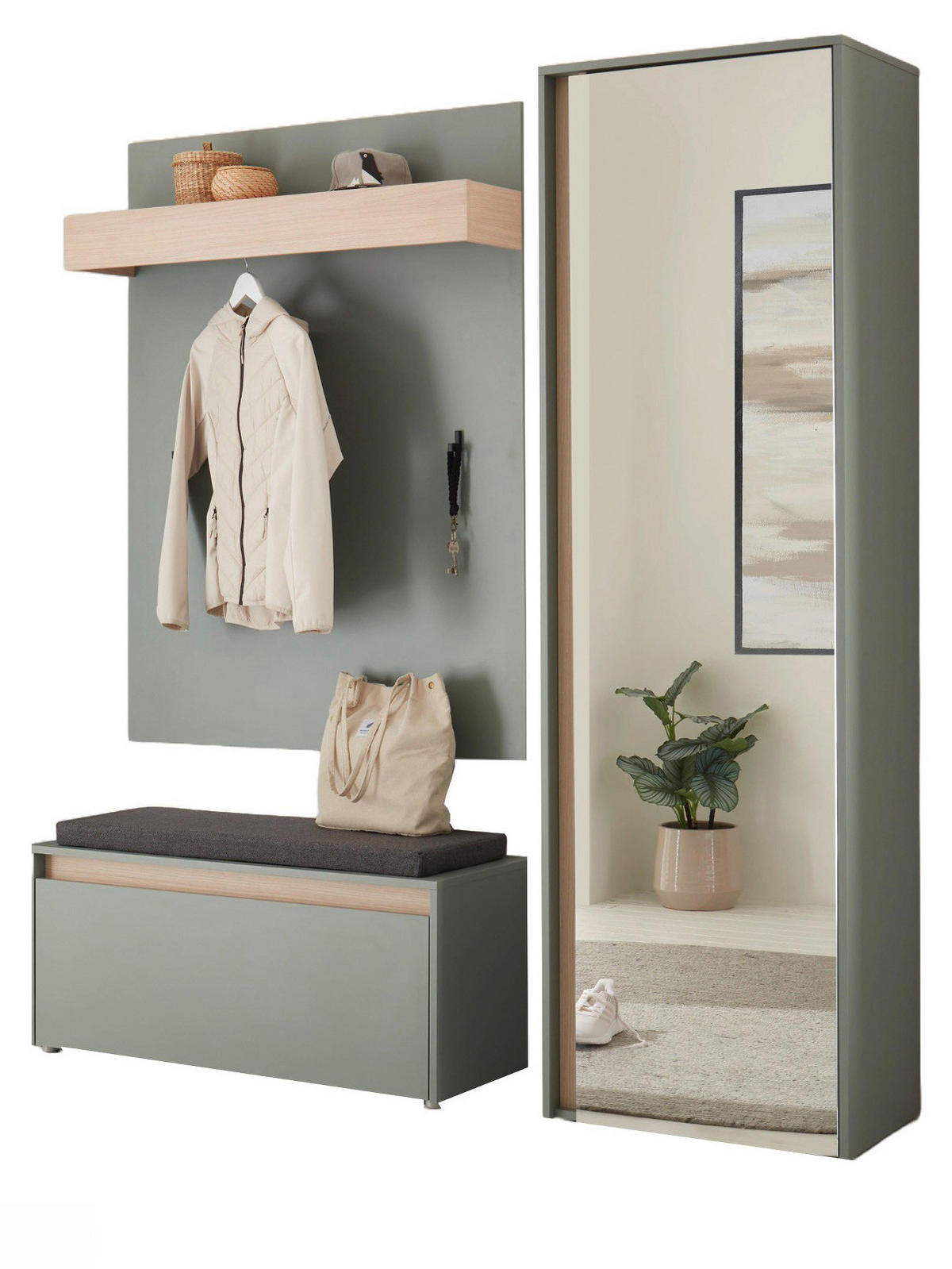 Garderoben-Set "Center" in Salbei Grün mit Barista Eiche Dekor, 4-teilig 170 x 200 cmDie 4-teilige Garderobenkombination Center in Salbei Grün mit Absetzung in Barista Eiche Dekor ist die perfekte Lösung für den modernen Flur. Mit Maßen von ca. 170/200/40 cm bietet das Set viel Stauraum und Funktionalität: ein Garderobenpaneel mit Hutablage,