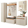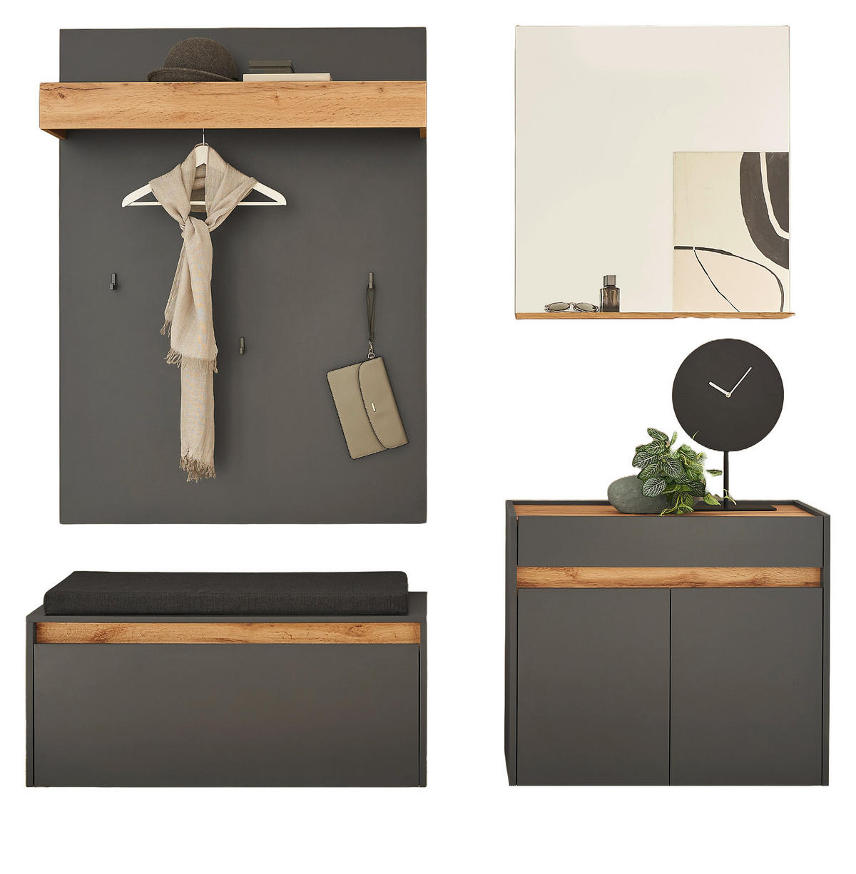 Garderoben Set "Center", grau matt und Wotan Eiche Dekor, 5-teilig, 190 x 200 cmDas 5-teilige Garderoben-Set „Center“ kombiniert Stil und Funktionalität für Ihren Flur. Es umfasst ein Garderobenpaneel mit Hutablage, eine Sitzbank mit Stauraum und Kissen, einen Spiegel mit Ablage und eine Kommode mit Schubkästen. Mit den Maßen 190 x 200 x 40 cm bietet es viel Stauraum und passt perfekt in kleinere Flure. Gefertigt aus FSC®-zertifiziertem Holzwerkstoff für Langlebigkeit und Nachhaltigkeit.