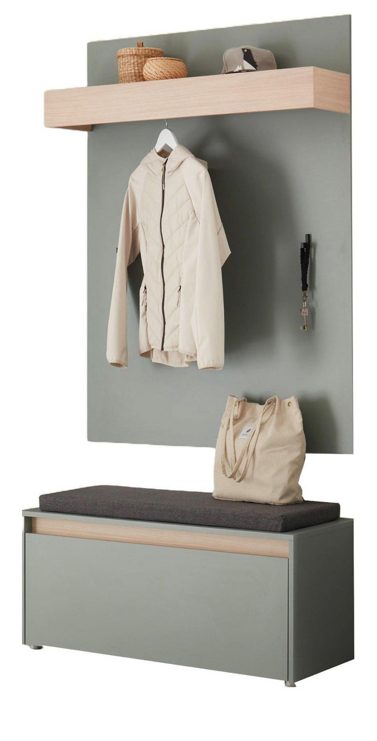 Garderoben-Set "Center" in Salbei Grün mit Barista Eiche Dekor, 3-teilig 100 x 200 cmDas kompakte Garderobenset Center in Salbei Grün mit Absetzung in Barista Eiche Dekor ist die ideale Lösung für kleine und schmale Flure. Mit Gesamtmaßen von ca. 100/200/40 cm kombiniert es ein praktisches