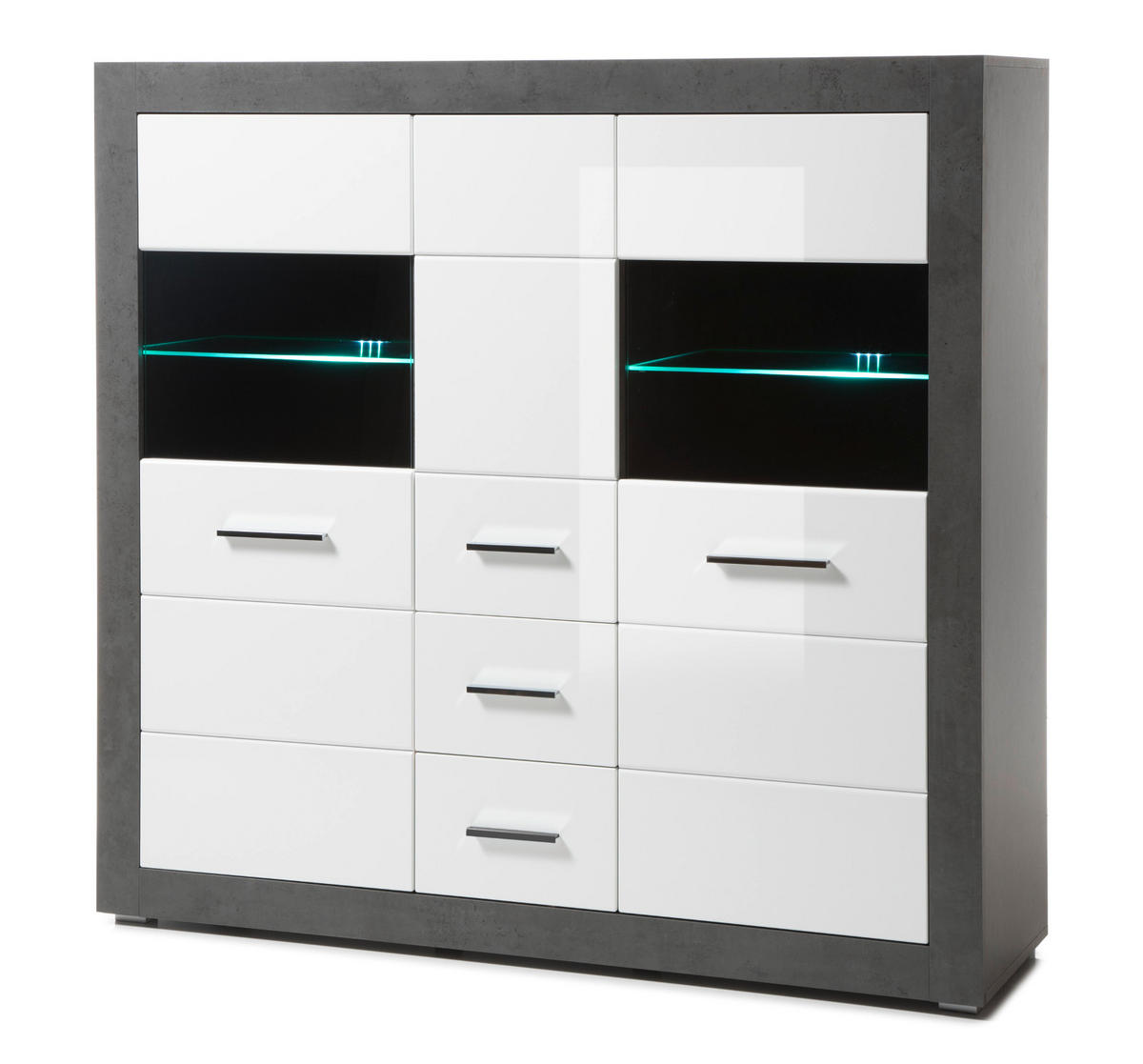 Highboard "Briard", weiß Hochglanz und grau Stone, 149 x 142 cmDieses Highboard sorgt für bewundernde Blicke. Das Modell "Briard" in weiß Hochglanz und grau Stone (149 x 142 cm) findet in Ihrem Wohn- oder Esszimmer einen Platz, ist mit einer Tür und zwei Glastüren versehen, hinter denen verschiedenste Gegenstände und Deko untergebracht werden können, und überzeugt mit zwei Schubkästen. Das Möbelstück bringt zwei Einlege-, zwei Glas- und einen Holzboden mit. Durch die herausragende Materialauswahl ist das Highboard im modernen, eleganten Design pflegeleicht. Mit dem FSC®-Gütesiegel leistet das Modell "Briard" in hochglänzendem Weiß und Stone Design Grau einen Beitrag zu mehr Nachhaltigkeit. Es hat eine Breite von 149 cm, eine Gesamthöhe von 142 cm sowie eine Tiefe von 42 cm und lässt sich mit fünf in einem Chrom-Farbton gehaltenen Griffleisten aus Metall öffnen und schließen. Dieses Highboard ist ein echter Gewinn für alle, die besonderen Wert auf schöne Möblierung legen.