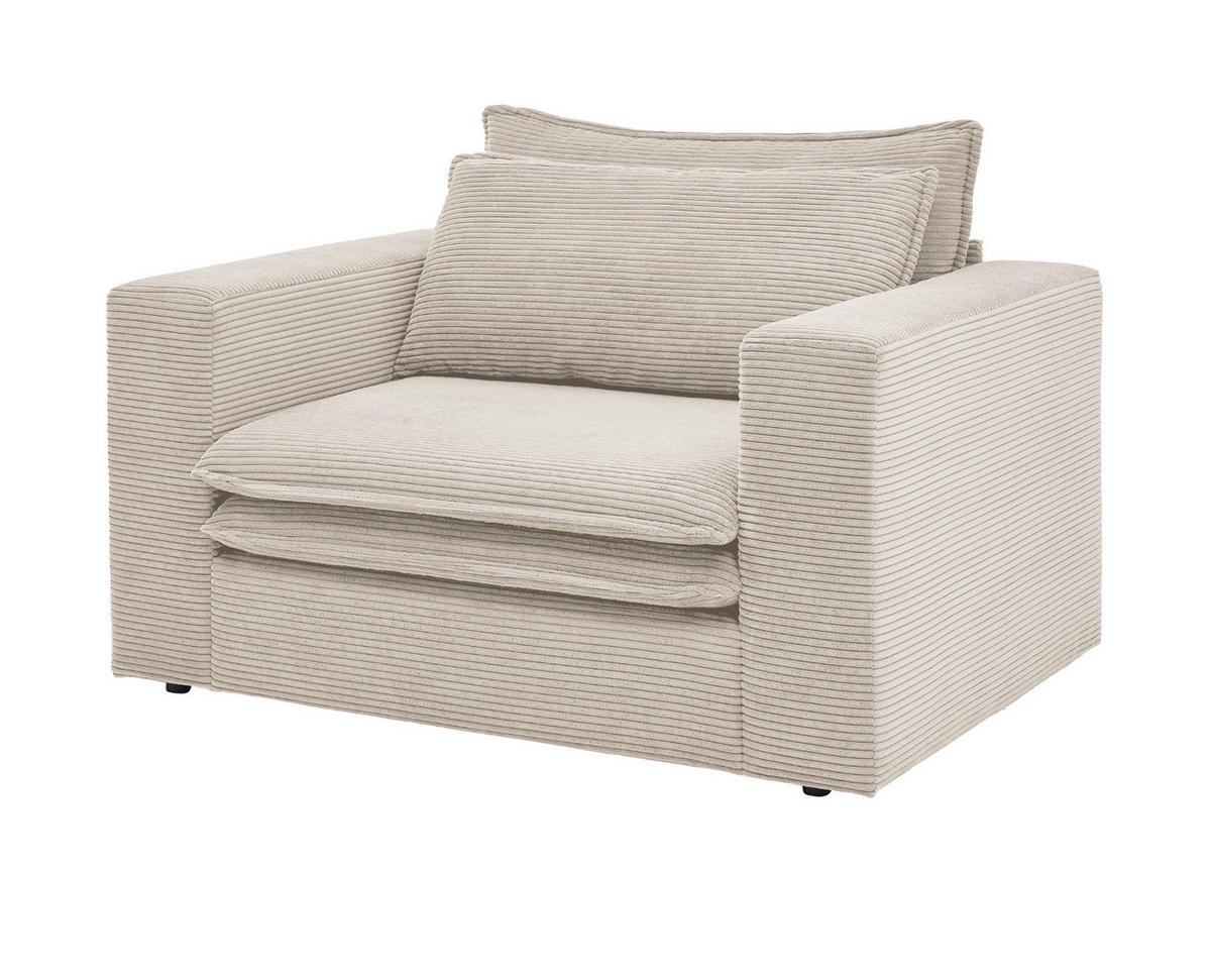 Sessel "Pesaro", beige Cord, 125 cmMachen Sie es sich auf diesem XXL Sessel so richtig bequem. Das Modell "Pesaro" in beige Cord (125 cm) ist für jedes Wohnzimmer hervorragend geeignet, macht in seinem modernen, trendigen Design eine perfekte Figur und zeichnet sich durch die zusätzliche Polsterung aus. Der Loveseat hat die Farbe Beige, kann mit seinem stilvollen Cordstoff-Bezug begeistern und ist mit 60 cm hohen Armstützen versehen. Er besitzt ein Breitenmaß von insgesamt 125 cm, eine Höhe von 83 cm sowie ein Tiefenmaß von 91 cm. Die Sitzfläche liegt bei 53 x 85 cm. Der Sessel "Pesaro" ist für ein Gewicht von 200 kg ausgelegt und weist eine Sitzhöhe von 43 cm auf. Mit Abriebwerten von 35000 Scheuertouren ist der Bezug extrem beständig. Außerdem kann das XXL Sitzmöbel in weiteren Größen- und Farbausführungen ausgesucht werden. Dieser Loveseat Sessel von Furn.Design sorgt für traumhafte Erholung - einzeln oder zu zweit.