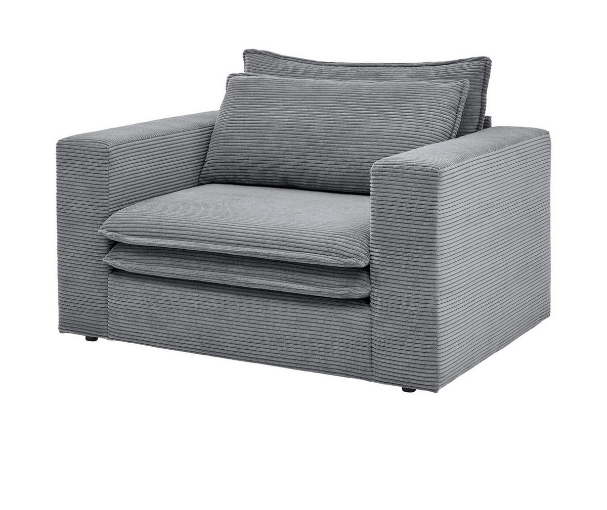 Loveseat Sessel "Pesaro", grauer Cord, 125 cmGönnen Sie sich mit diesem XXL Sessel jederzeit eine gemütliche Entspannungspause. Das Modell "Pesaro" in grau Cord (125 cm) wird in jedem Wohnzimmer garantiert zu Ihrem neuen Lieblingsplatz. Es überzeugt mit seinem trendigen, modernen Design. Der Loveseat kann mit seinem ansprechenden Cordstoffbezug begeistern. Der Sessel "Pesaro" von Furn.Design hat die Farbe Grau, zeichnet sich durch die zusätzliche Sitzpolsterung aus und ist mit 60 Zentimeter hohen Armstützen versehen. Es weist ein Breitenmaß von stattlichen 125 Zentimetern, eine Höhe von 83 Zentimetern und eine Tiefe von 91 Zentimetern auf. Das Polstermöbel hat eine Sitzhöhe von 43 Zentimetern. Die Sitzfläche des XXL Sessels misst 53 x 85 Zentimeter. Der Loveseat "Pesaro" hält Belastungen von bis zu 200 Kilogramm stand. Darüber hinaus ist der Bezug mit Abriebwerten von mindestens 35000 Scheuertouren sehr robust. Das Modell "Pesaro" steht in verschiedenen Größen- und Farbausführungen zur Verfügung. Dieses Sitzmöbel wartet nur auf Sie.