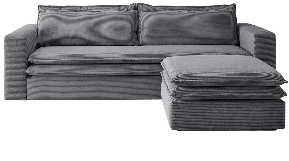 Sofa Set "Pesaro", grauer Cord Couch, 3-Sitzer mit Bettfunktion, inkl. HockerFür gemütliche Stunden in Ihren vier Wänden ist dieser 3-Sitzer genau richtig. Das Modell "Pesaro" in grauem Cord (244 cm) ist optimal für Ihr Wohnzimmer zum geselligen Sitzen, Erzählen oder Spielen und macht in seinem trendigen, modernen Stil eine ideale Figur. Aufgrund der ausgezeichneten Materialien hat das graue Couch Set eine besondere Qualität. Es ist dank seines Cordstoff-Bezugs ausgesprochen gemütlich und besitzt Armlehnen, welche 60 cm hoch sind. Das Modell "Pesaro" aus dem Hause Furn.Design lässt sich aufgrund der Bettfunktion schnell zu einem behaglichen Gästebett umbauen und wird mit dem im Lieferumfang enthaltenen Hocker noch bequemer. Lose Rückenkissen steigern den Komfort des Sitzmöbels. Der 3-Sitzer "Pesaro" weist eine Breite von 244 cm, eine Gesamthöhe von 83 cm sowie eine Tiefe von 91 cm auf. Der extrem beständige Bezug übersteht 35000 Scheuertouren. Die Sitzfläche misst 53 x 200 cm. Die Couch weist eine Sitzhöhe von 43 cm auf, ist mit einem Gewicht von 350 kg belastbar und ist in unterschiedlichen Farb- und Größenausführungen vorhanden. Lehnen Sie sich entspannt zurück und genießen Sie Ihren Feierabend auf diesem Sofa Set.