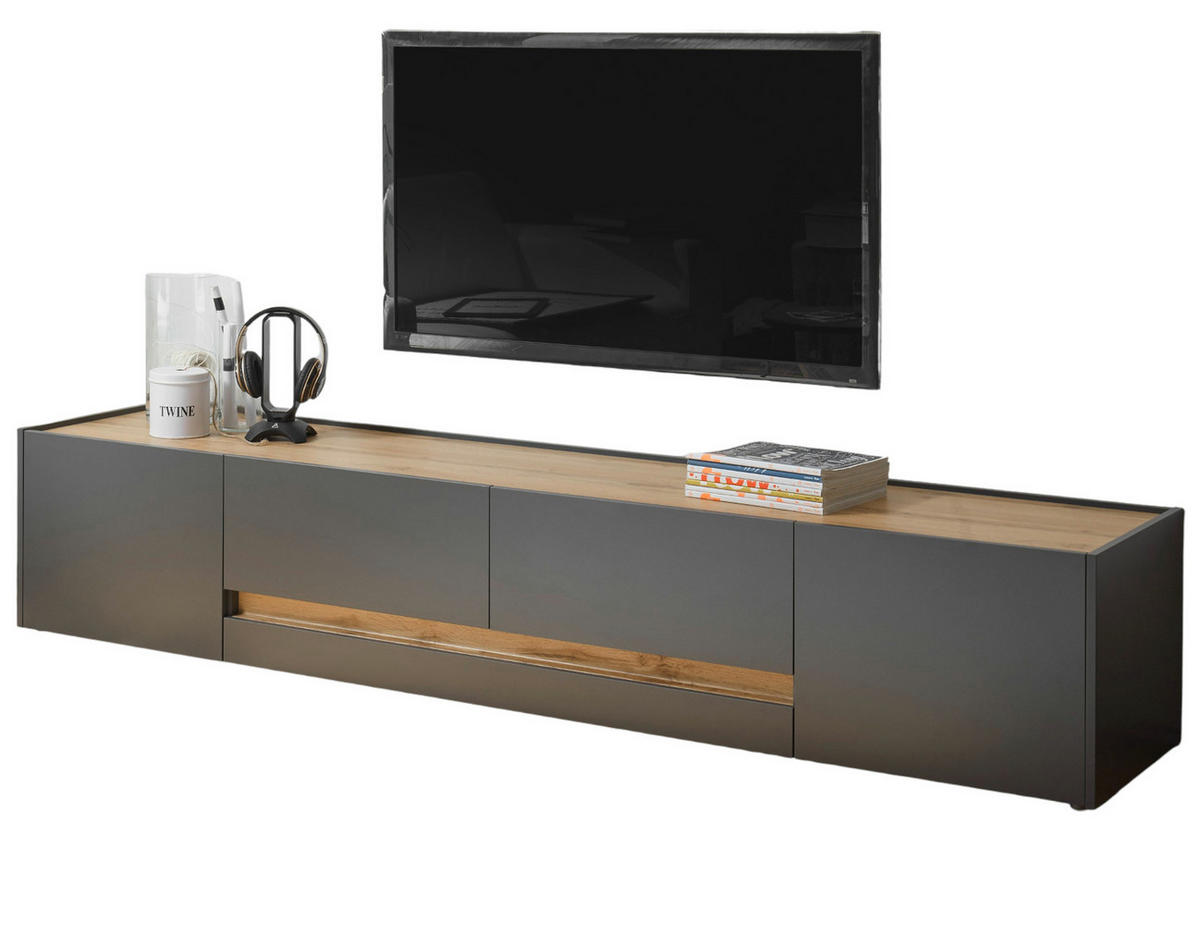 Eine echte Bereicherung für die eigenen vier Wände ist das elegante TV-Lowboard "Center".Das TV-Lowboard "Center" in XL-Format kombiniert modernes Design mit praktischer Funktionalität. Graue matte Oberflächen und Absetzungen in Wotan Eiche Dekor verleihen dem TV-Unterteil von Furn.Design eine elegante Optik. Zwei Türen, geschlossene Fächer und zwei Schubkästen bieten großzügigen Stauraum. Hergestellt aus FSC®-zertifiziertem Holzwerkstoff überzeugt es durch pflegeleichte, strapazierfähige Oberflächen und zeitloses Design.