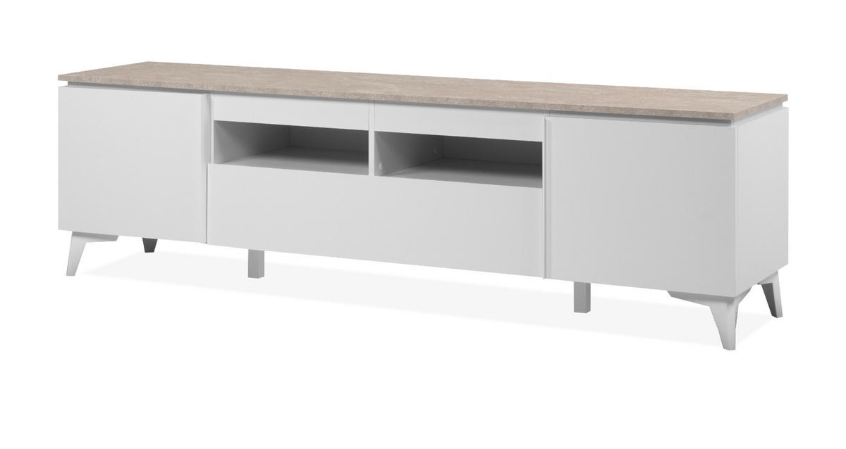 TV-Lowboard "Visby", weiß und Sandstein Dekor, 177 x 52 cmDas TV-Lowboard Visby von Furn.Design (177 x 51,5 x 40 cm) überzeugt mit weißem Korpus, Oberboden in Sandstein-Dekor und moderner Schattenfuge. Zwei Türen, ein breiter Schubkasten, vier geschlossene Fächer und zwei offene Gerätefächer bieten viel Stauraum für Medienzubehör. Weiße Griffleisten und V-Füße runden das stilvolle Design ab.