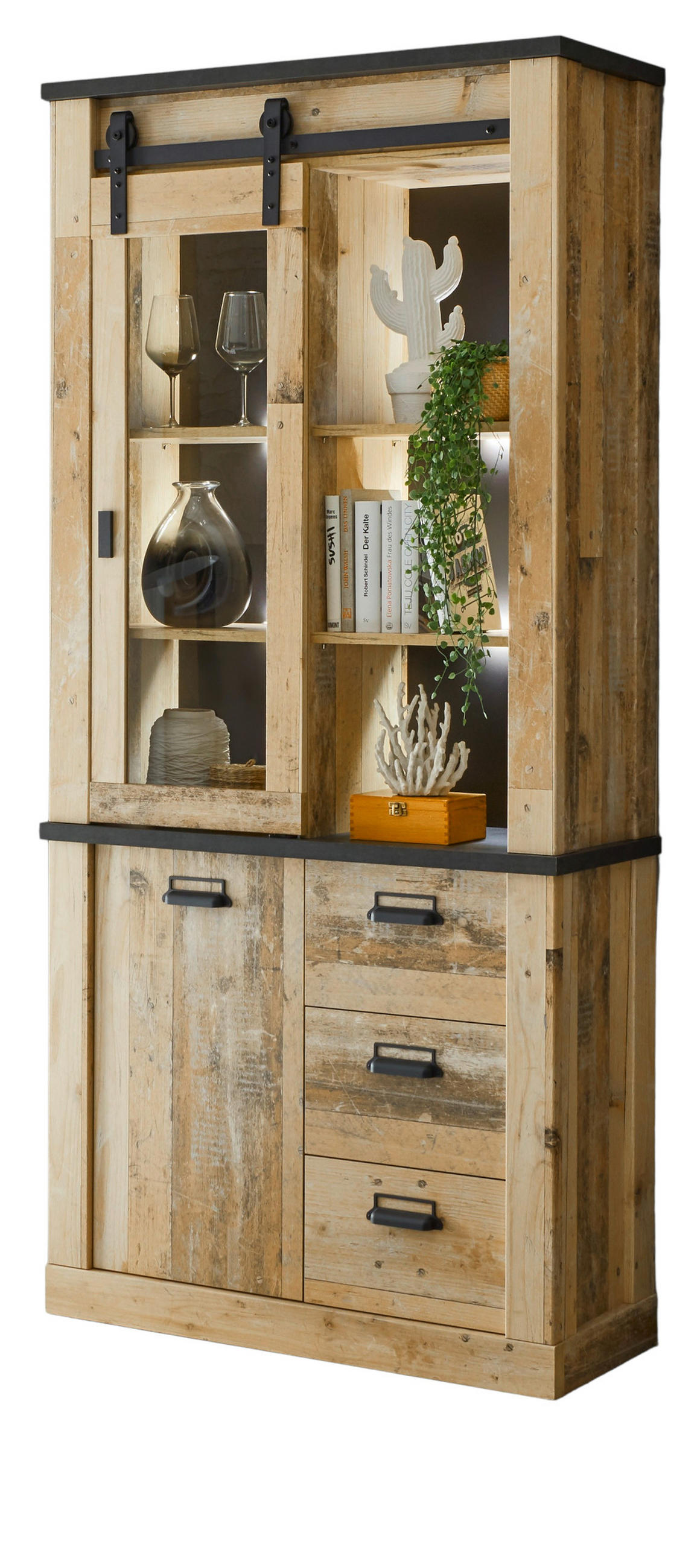 Furn.Design VITRINE Used Wood hell, anthrazit 93 x 201 cm, Vitrinenschrank mit Soft-Close