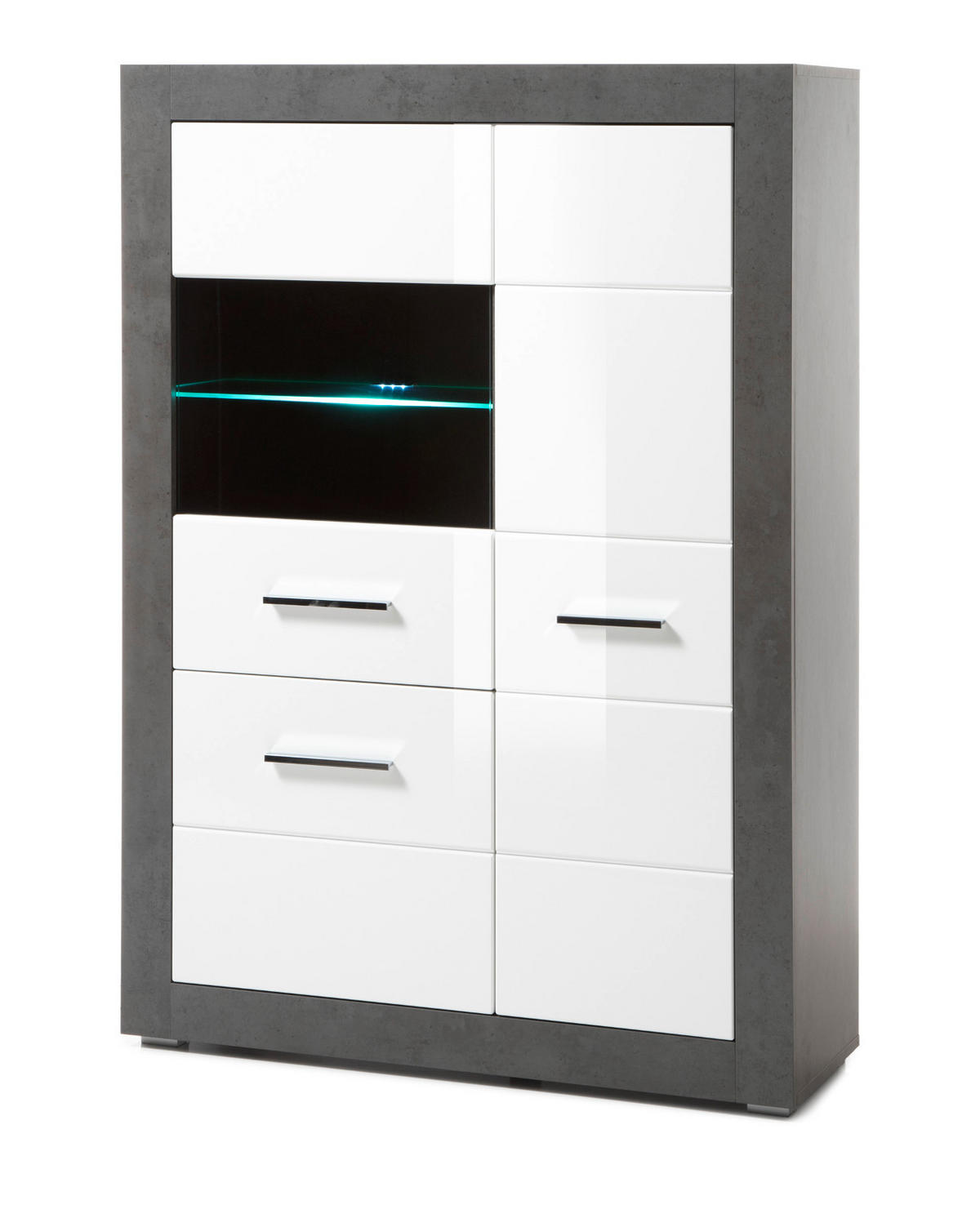 Vitrine "Briard", weiß Hochglanz und grau Stone, 100 x 142 cmSie können Ihre liebsten Erinnerungsstücke und Souvenirs durch die Vitrine "Briard" in weiß Hochglanz und grau Stone (100 x 142 cm) perfekt präsentieren. Das Möbel ist für jedes Wohn- und Esszimmer ideal geeignet. Hinter zwei Türen sowie einer Glastür können verschiedenste Gegenstände und Deko verstaut werden. Das Modell "Briard" verfügt über zwei Glas- sowie zwei Einlegeböden. Aufgrund der herausragenden Materialauswahl ist die Vitrine pflegeleicht. Sie ist in hochglänzendem Weiß und Stone Design Grau gehalten. Das Modell "Briard" bereichert Ihr persönliches Einrichtungskonzept durch das moderne, elegante Design zusätzlich. Das Möbel leistet dank des FSC®-Labels einen Beitrag zu mehr Nachhaltigkeit und besticht mit drei in einem Chrom-Farbton gehaltenen Griffleisten aus Metall. Es hat eine Gesamtbreite von 100 cm, eine Höhe von 142 cm sowie eine Tiefe von 35 cm. Außerdem kann das Modell "Briard" in weiteren Größenvarianten ausgesucht werden. Mit dieser Vitrine werden Dekoelemente, Ihre Familienfotos oder Ausstellungsstücke angemessen präsentiert.