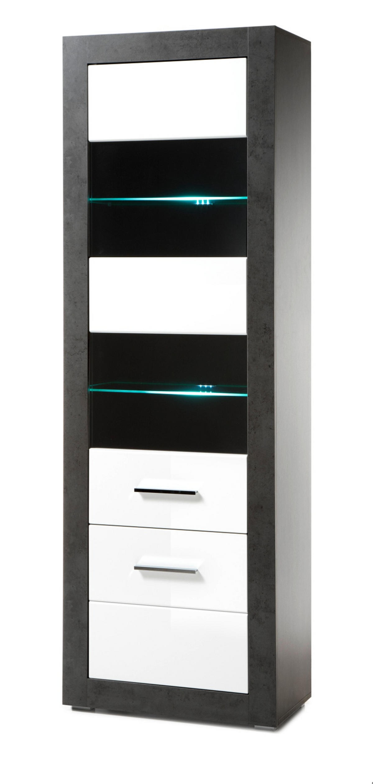 Vitrine "Briard", weiß Hochglanz und grau Stone, 65 x 198 cmDie Vitrine "Briard" in weiß Hochglanz und grau Stone (65 x 198 cm) präsentiert Ihre persönlichen Erinnerungsstücke und Urlaubsmitbringsel ideal. Ob im Wohn- oder Speisezimmer – dieses Möbel wertet auch Ihr Zuhause optisch auf. Zwei Glas- und ein Holzboden schaffen ein großes Maß an Stauraum. Das Modell weist eine Glastür und eine Tür auf, hinter welchen sich Ihnen Platz zum Unterbringen verschiedenster Gegenstände und Deko, und ist in hochglänzendem Weiß und Stone Design Grau gehalten. Es wurde aus FSC®-zertifiziertem Material aus nachhaltig bewirtschafteten Wäldern hergestellt und kann auch optisch durch sein elegantes, modernes Design überzeugen. Dank der pflegeleichten Beschaffenheit werden Sie viel Freude an dieser Vitrine haben. Das Modell "Briard" besitzt zwei ästhetische chromfarbene Griffleisten, die aus Metall gefertigt sind. Es weist eine Breite von insgesamt 65 cm, eine Höhe von 198 cm sowie eine Tiefe von 35 cm auf. Dieses Möbelstück gibt es auch in verschiedenen Größenvarianten. In der Vitrine finden Sie genügend Platz, um Ausstellungsstücke, Ihre liebsten Schätze oder Dekoelemente zu präsentieren.
