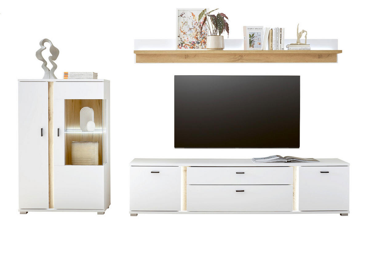 Furn.Design WOHNWAND 3-teilig weiß matt, Eiche Wotan 290 cm, Wohnkombination inklusive Frontbeleuchtung und viel Stauraum