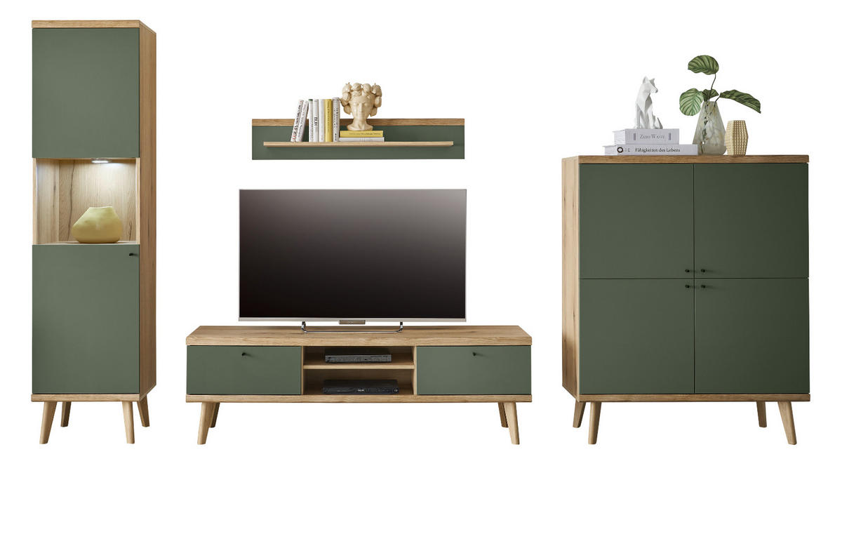 Furn.Design WOHNWAND 4-teilig salbei grün, Eiche Evoke, skandinavisch 337 cm, Schrankwand mit viel Stauraum