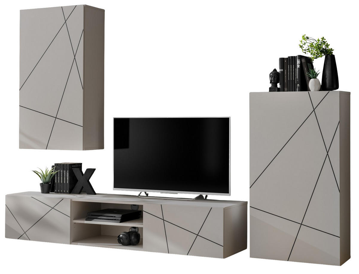 Furn.Design WOHNWAND Kaschmir, schwarz 260 cm, Schrankwand mit Streifendruck, Push-to-Open