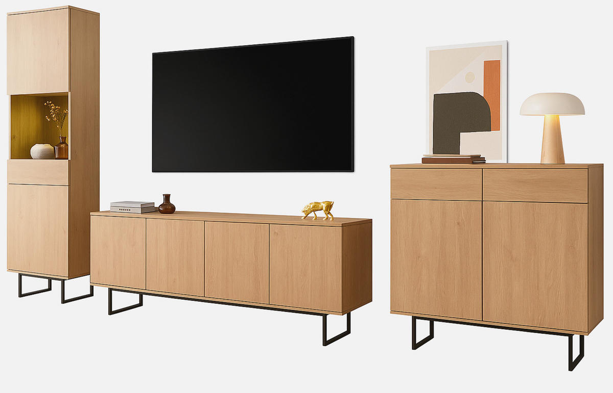 WOHNWAND in Eiche Dekor, Wohnzimmer Set mit TV Lowboard 200 cm und Highboard 4-türig, Push-To-Open
