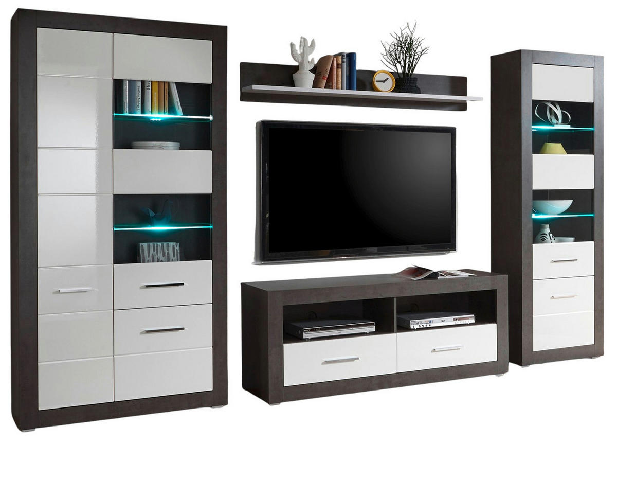Wohnwand "Briard", weiß Hochglanz mit grau Stone, 4-teilig, 335 x 198 cmDie 4-teilige Wohnwand "Briard" in Weiß Hochglanz mit Grau Stone (335 x 198 cm) ist die perfekte Wahl für ein stilvolles Zuhause. Sie umfasst zwei Vitrinen, ein TV-Element und ein Wandboard, und bietet mit ihren 17 Fächern vielfältigen Stauraum für Ihre Gegenstände und Dekoration. Die Kombination aus hochglänzendem Weiß und Grau Stone Design schafft eine moderne und elegante Atmosphäre. Mit pflegeleichten Oberflächen und dem FSC®-Label für nachhaltige Forstwirtschaft überzeugt die Wohnwand sowohl funktional als auch ökologisch.